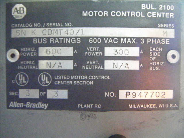 2003 Allen-Bradley Series-M Motor Control Center. Cat No: K CDMT40/1. Bus ratings: 600 VAC (max). Horizontal power: 600 amps. Vertical power (ea. side): 300 amps. 60 Hz. 3 phase. Power supply: 208-480 V, 3 phase, control supply: 100-240 VAC, 47-63 Hz, control circuit fuse: 10 amps (max). Allen-Bradley Series-A, Cat. No: 825-MCM20. Overall dimensions: 2 ft. 10 in L x 1 ft. 10 in. W x 7 ft. 6 in. H.(H11).