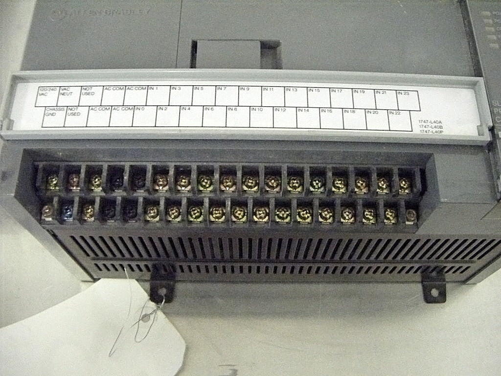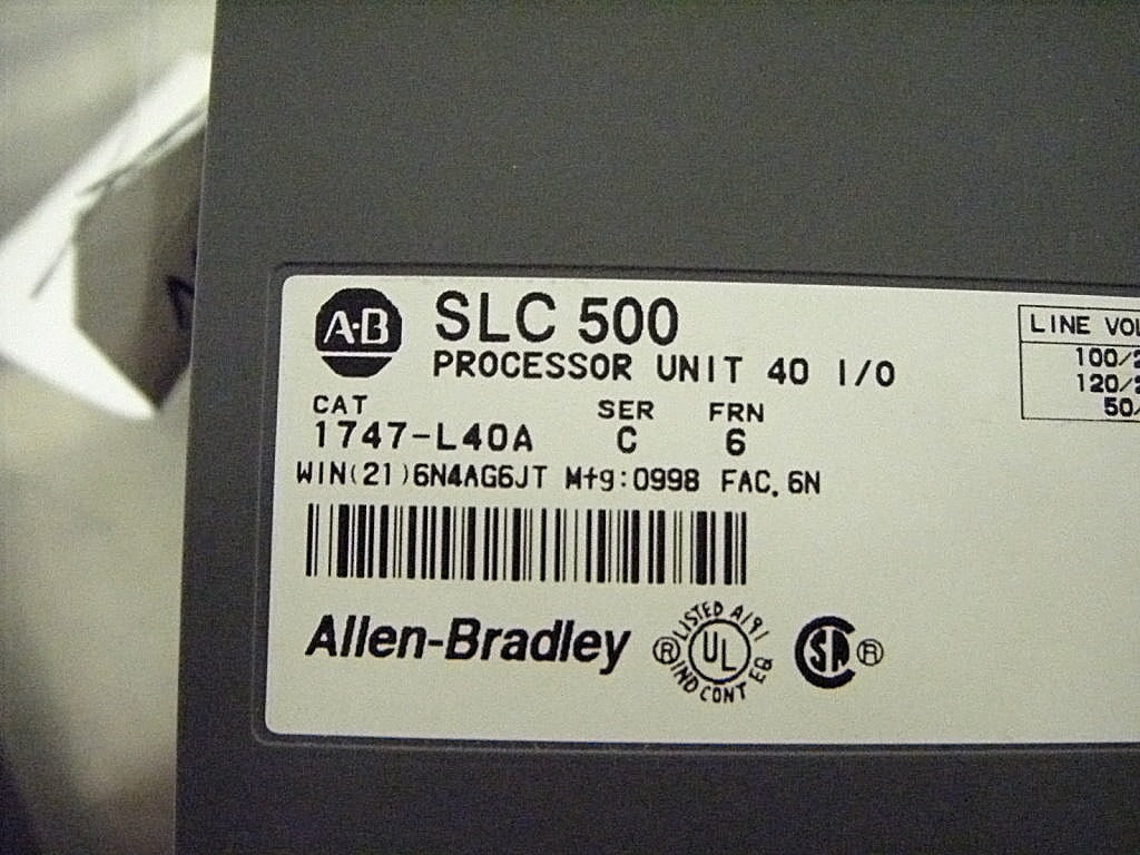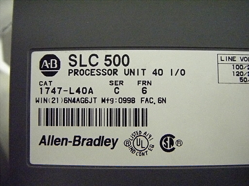 Allen-Bradley SLC 500 processor unit 40 I/O. Model: SLC 500 CAT 1747-L40A SER C FRN 6. Input voltage: 85-132 VAC, 50/60 Hz. Output voltage: 10-250 VAC, 50/60 Hz, 10-125 VDC. Mounting holes center on length: 6-1/4 in. Mounting holes center on width: 6-7/8 in. Overall dimensions: 5-3/4 in. L x 10-1/4 in. W x 5-1/2 in. H.(ACN10).