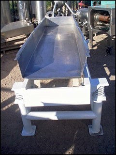 Allen Machinery (Now PPM Technologies) Vibrating Conveyor. Model: D14647. Type: C. Inside dimension of stainless steel tray: 5 ft. 11-1/2 in L x 1 ft. 8 in. W x 6 in. H. 3 sets leaf springs. Dayton Electric Motor, 1-1/2 hp. Overall dimensions: 6 ft. 1/2 in. L x 3 ft. W x 3 ft. 4 in. H.(ACN315-87).