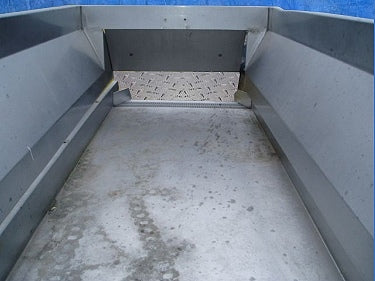 Allen Vibrating Conveyor. Model: VC10107. S/N: CON11153. This system consists of a trough and trough connecting bracket coupled to a drive by means of leaf springs; the vibrating stroke is repeated at high speeds. Infeed hopper dimensions: 103 in. L x 48 in. W x 29 in. H. Vibrating trough dimensions: 118 in. L x 48 in. W x 6 in. H. (2) Pneumatic pistons lift/lower a 36-1/2 in L x 15-1/2 in H front access door. (1) Filtration screen. Norgren control valve, maximum inlet pressure: 300 psi, maximum outlet pressure: 100 psi. Parker Hydraulic Motor, Model: TF0080, displacement: 81 cu.in./rev, maximum control pressure: 3000 psi, maximum operating speed: 693 rpm. Inlets: infeed hopper. Outlets: (1) 48 in. W x 6 in. H discharge chute. Overall dimensions: 12 ft. 6 in. L x 57 in. W x 63 in. H.