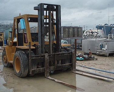 Allis-Chalmers Forklift. Model: Liftall/Allison 500. S/N: 77379. Fork dimensions: 72 in. L x 6 in. W. Fuel: diesel. John Deere diesel engine, control: 30075, basic engine: 10518. Air filter: WIX 42222. Fuel filter: Stanadyne Automotive Corporation 18786. Oil filter: 51243. (4) Front tires: Firestone Transport 1, tube type, nylon, regroovable, 12-ply rated, sidewall: 6-plies, inflation: 5150 lb @ 90 psi cold (single)/ 4520 lb @ 85 psi cold (dual), size: 9.00-20. (2) Rear tires: Power King, tube type, nylon, regroovable, 14-ply rated, tread: 10-plies, sidewall: 8-plies, inflation: 5050 lb @ 100 psi cold (single)/ 4430 lb @ 90 psi cold (dual), size: 10.00-15. Overall dimensions: 19 ft. 6 in. L x 96 in. W x 99 in. H.