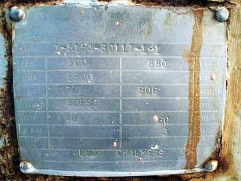 Allis-Chalmers Motor- 300 HP. Model: 906. S/N: 1-5154-30117-1-1. Motor specifications: 880 rpm, 2300 V, 70 amps, 60 Hz, 3 phase. Frame: 30FS8. Type: AW. Overall dimensions: 70 in. L x 45 in. W x 41-1/2 in. H.(H10).