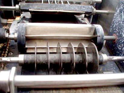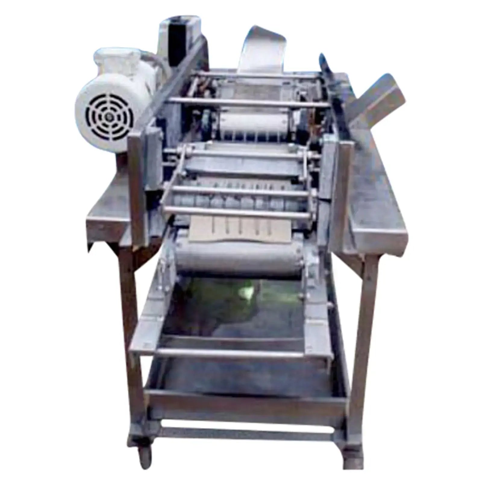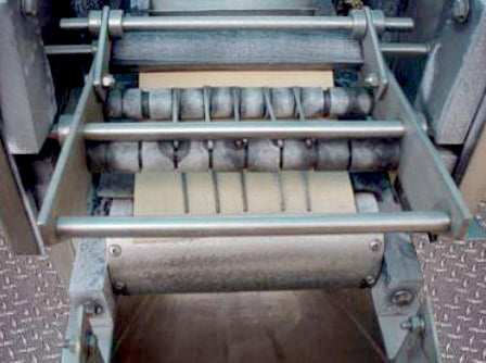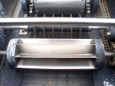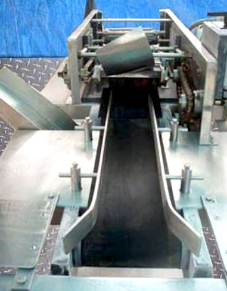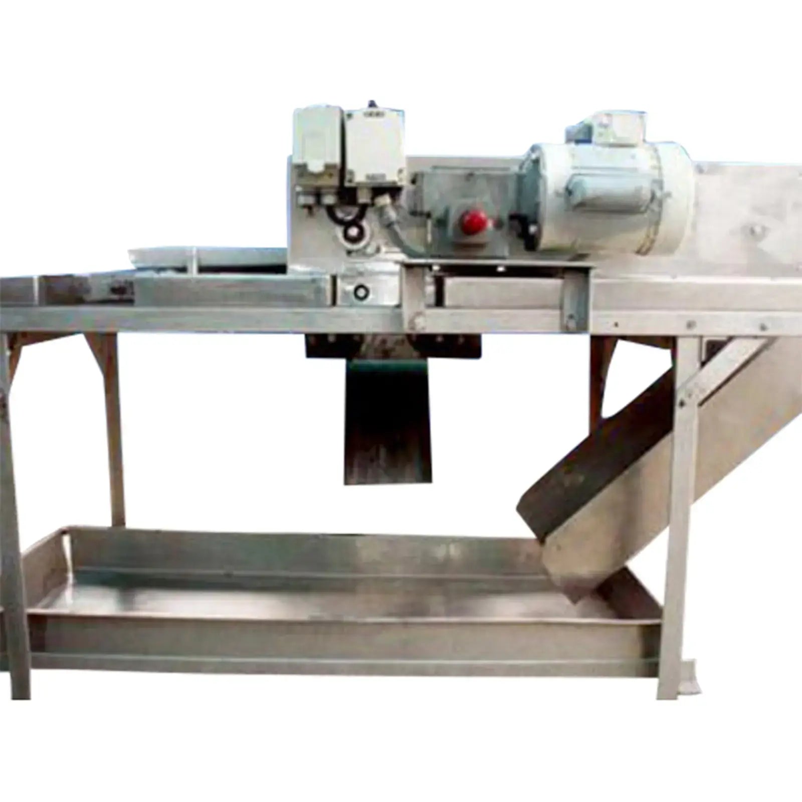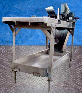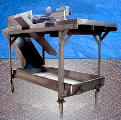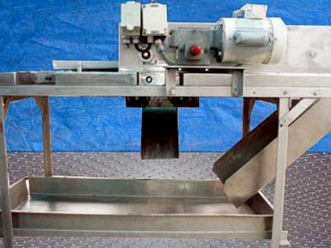 Aloe Vera Leaf Cubing Machine. Makes 1 in. long x 1 in. wide cuts. Number of rotating blades: (6) 3 in. dia. Distance between blades: 1 in. Drum blade with (8) cutting knives: 3 in. dia. x 8-1/2 in. L. Distance between blades: 1 in. Maximum leaf width: 6 in. Infeed conveyor belt width: 6 in. W. Discharge conveyor belt width: 7 in. W. Dayton Electric Wash-Down Duty Motor, 1/2 hp, 1725 rpm, 115/230 V, 9/4.5 amps, 60 Hz, single phase. Winsmith D-90 Drive, ratio of 15, 115 rpm (final). Conveyor infeed/exit height: 36 in. Outlets: (1) 29 in. L x 12 in. W discharge chute. Overall dimensions: 6 ft. 2 in. L x 2 ft. 10 in. W x 4 ft. 1 in. H. (GM).
