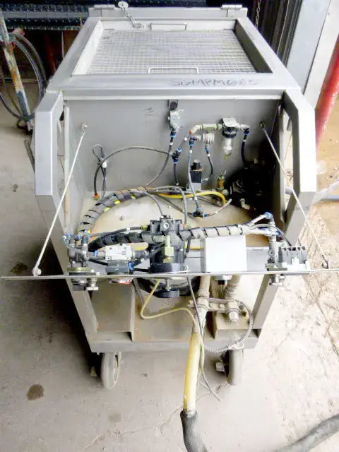 Using commercially available dry ice pellets that are manufactured from CO2 recaptured as a byproduct from other industrial processes, the Miniblast™ PLT-5X is a green alternative to blast cleaning as the dry ice disappears on impact with targeted surface. Hours on machine are: 279.6. Overall dimensions: 4 ft. L x 4 ft. 6 in. W x 4 ft. H.(ACN149).