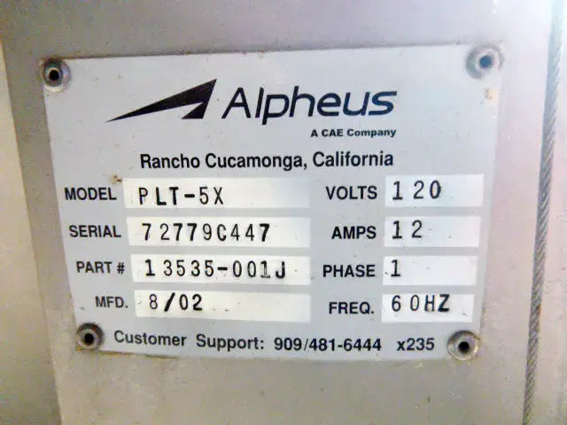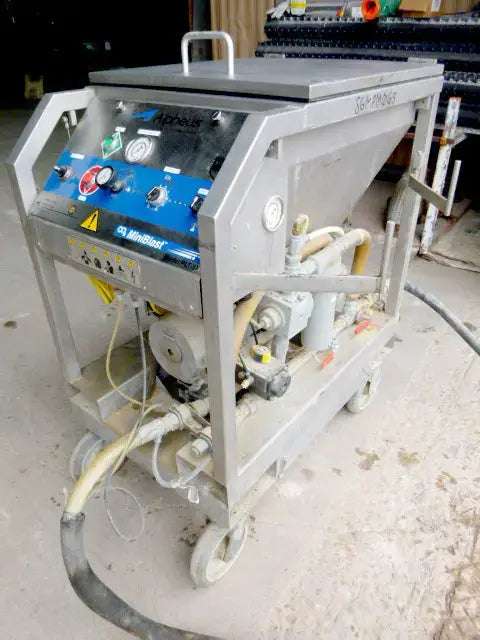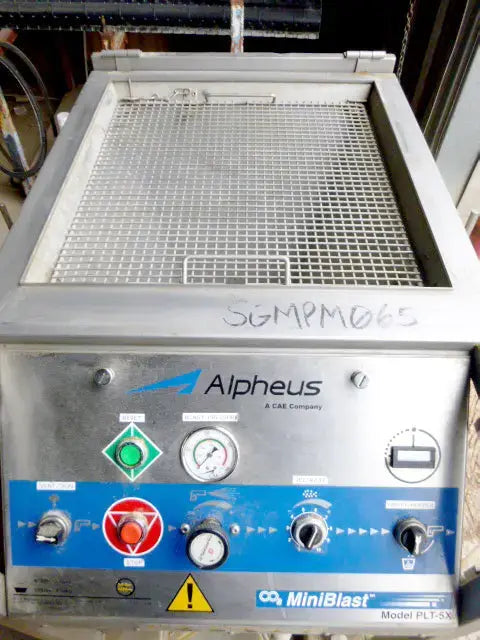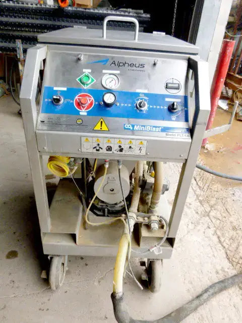 2002 Alpheus PLT-5X CO2 Miniblast™ Dry Ice Cleaner. Model: PLT- 5X. Maximum feed capacity 10 lbs./minute. Electrical requirement: 120V, 12 amps, 60 Hz, 1 phase. Features include: stainless steel construction, available blasting pressures from 20-120 PSI using wands with of either 1 or 2 inch wide openings with a 12 inch extension available for either. Approximate length of hose is 900 ft.