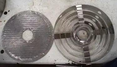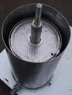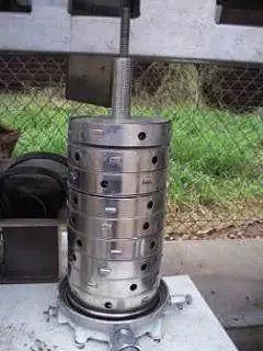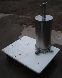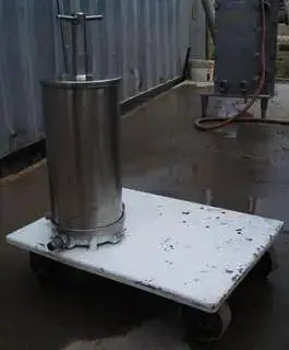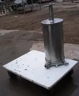 Alsop Sealed Disc All-Purpose Filter. Model: SD8-SWR-20. 304 stainless steel. Sludge capacity: 420 cu. in. of filter cake. Non-jacketed housing. Housing dimensions: 8 in. dia. x 15 in. H. Product passes through (20) filter pads and (9) screens held in place by (9) Frame inside housing. Filtration area: 4.65 sq. ft. Inlets: (1) 1 in. barb fitting. Outlets: (1) 1 in. ACME fitting. Wide inlet rings allow for the accumulation of filter cake or sludge. Overall dimensions: 2 ft. 2 in. L x 1 ft. 8 in. W x 2 ft. 8 in. H.(ACN65).