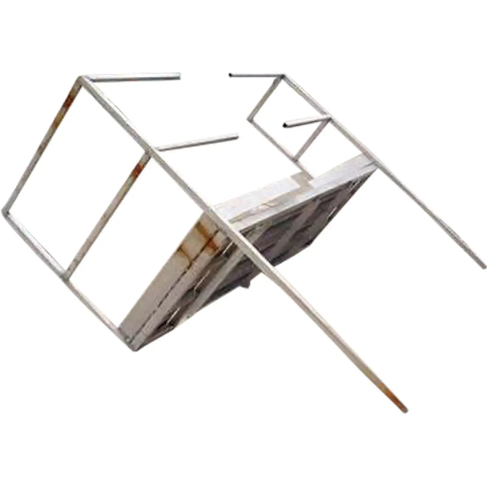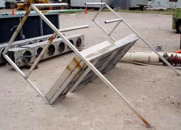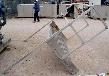 Aluminum Platform with Guard Rails. Walkway distance from ground level: 4 ft. 1 in. H. Walkway dimensions: 8 ft. 5 in. L x 3 ft. 1 in. W. Guard rails: 3 ft. 7 in. H. (2) 4 ft. H legs. Overall dimensions: 8 ft. 9 in. L x 2 ft. 4 in. W x 7 ft. 8 in. H.