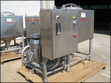 2003 American Ingredients Company Breddo Likwifier, Liquifier. Model: LOS. Tank capacity 300 gallons. Materials of construction: 316 stainless steel. Sterling Electric Motor, model: T-MTR2100, TEFC enclosure, 60 hp, 1770 rpm, 230/460V, 1.15 sf, 60 Hz, 3 phase. Control & Drive Systems, Inc. model: D-187157-1. 460V, 96 amps, 60 Hz, 3 phase. Allen-Bradley PowerFlex 700. Cat no. 20B D 096 A O ANNANA0. Hammond Manufacturing enclosure: 4X, 4, 12, product no. 1418N4SSM12. Manway 24 in. diameter. (1) 4 in. diameter spray ball. Tank inlet / outlet sanitary fittings: (2) 2 in., (1) 1-1/2 in., (1) 3 in. gasketed fume cap. Overall dimensions: 6 ft. 10 in. L x 5 ft. 3-1/4 in. W x 6 ft. 2-1/2 in. H.(H12)(ACN510).