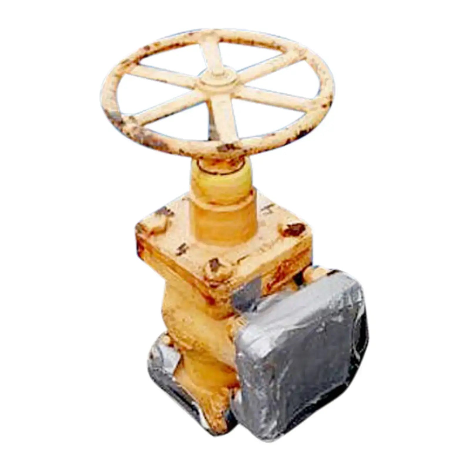 Ammonia Valve- 90°. Handle diameter: 10 in. Inlets/outlets: (2) 4 in. dia. ports with 7 in. L x 7 in. W square flanges. Overall dimensions: 12 in. L x 10 in. W x 18 in. H.
