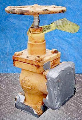 Ammonia Valve- 90°. Handle diameter: 10 in. Inlets/outlets: (2) 4 in. dia. ports with 7 in. L x 7 in. W square flanges. Overall dimensions: 12 in. L x 10 in. W x 18 in. H.