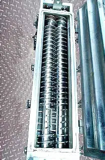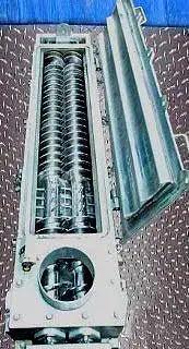 Anderson Dahlen Double Screw Conveyor / Bin Discharger. Material of construction: Stainless steel. Double screw: 5 in. dia. x 4 ft. 3 in. L. Dorris motor drive, 11.7 ratio, 12.6 hp, input rpm: 1750. Tilt base to 45 degrees. Inlet: 6 in. dia. port. Outlet: 10 in. L x 6 in. W port. This unit designed to mix a dry flour product and can be used for removing material from bulk silos or other large storage hoppers. Overall dimensions: 6 ft. 3 in. L x 1 ft. 8 in. W x 2 ft. 3 ½ in. H.(ACN350).