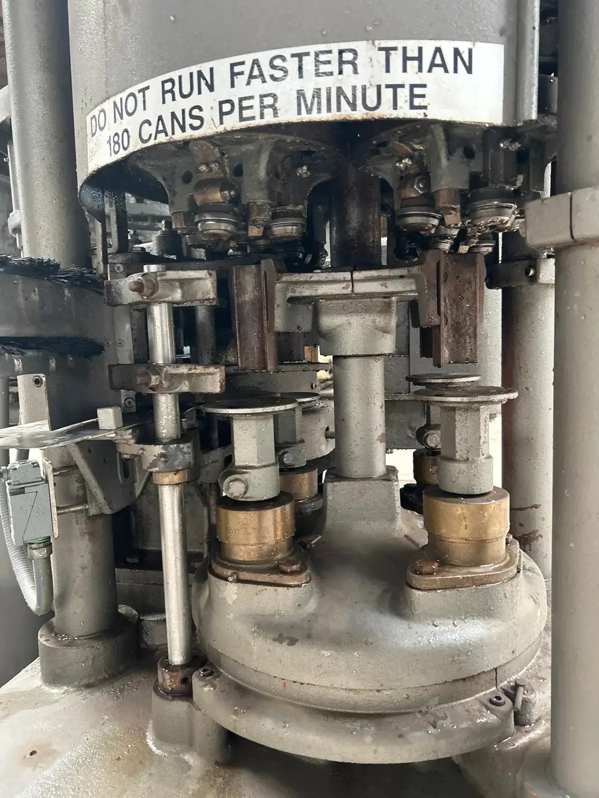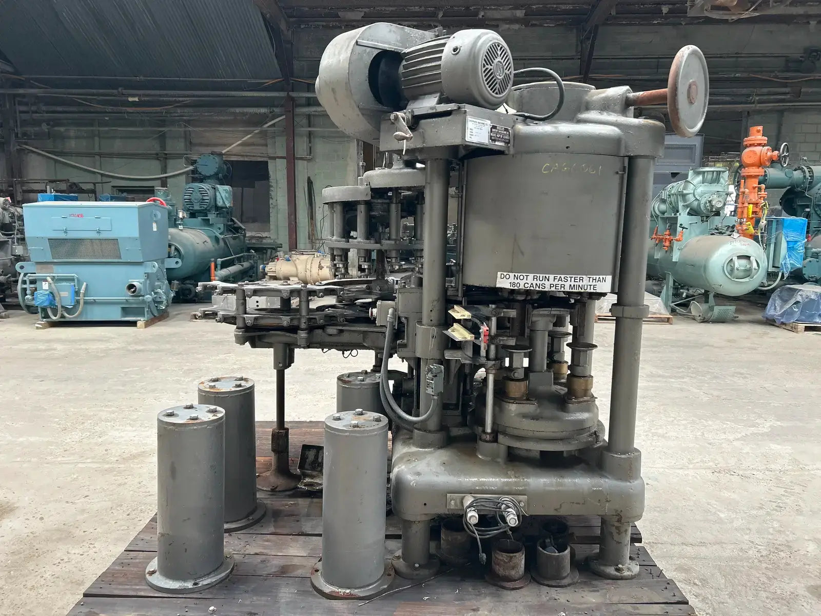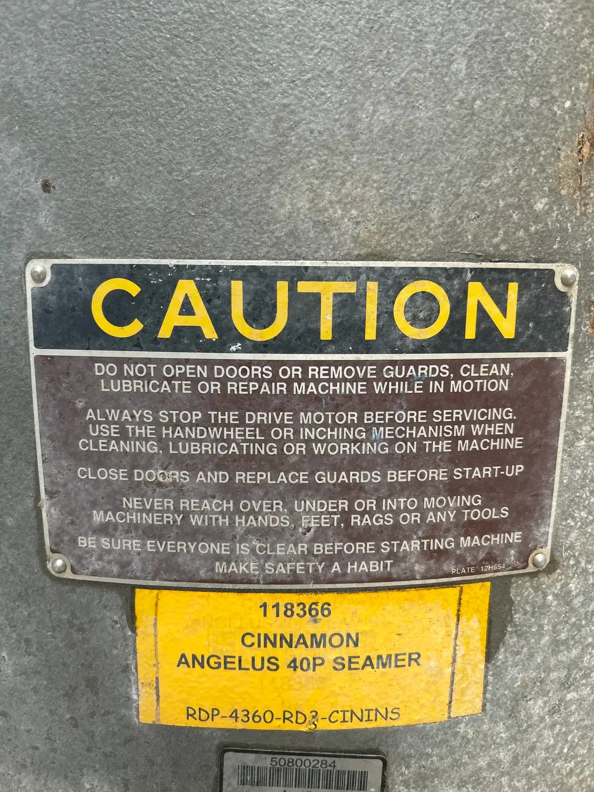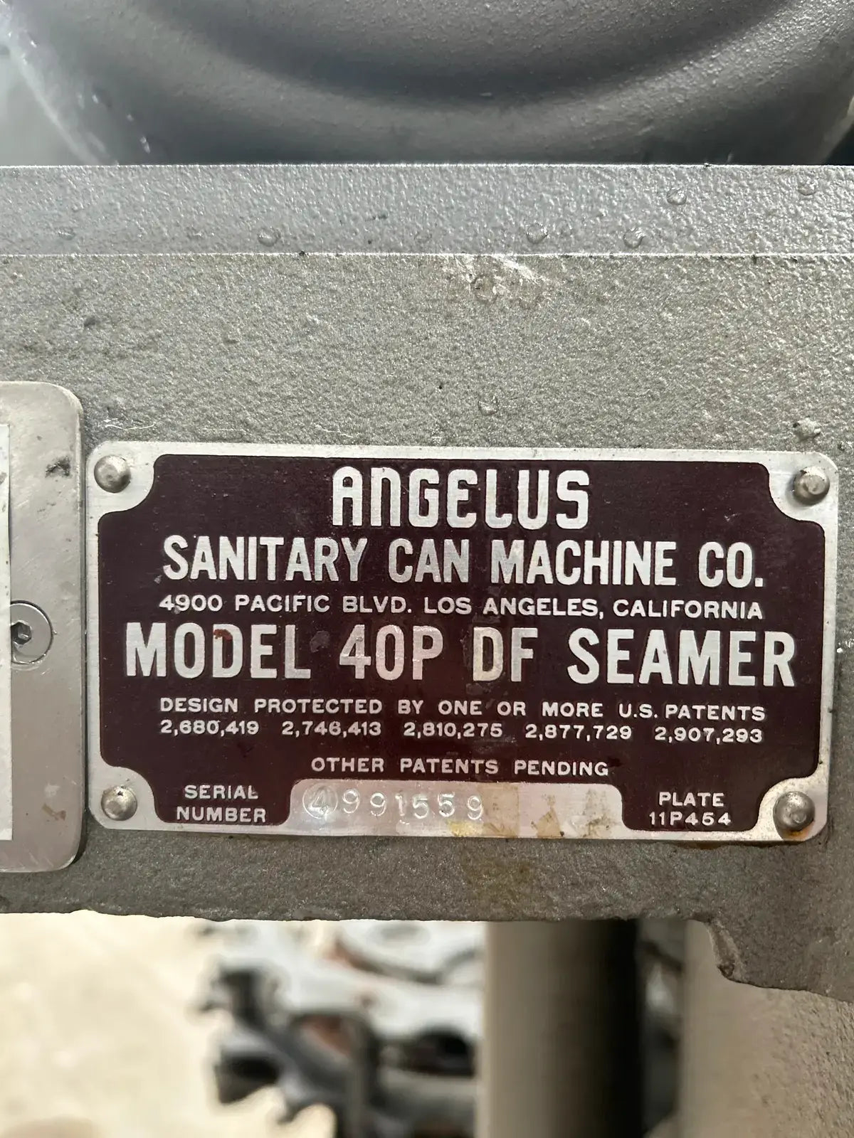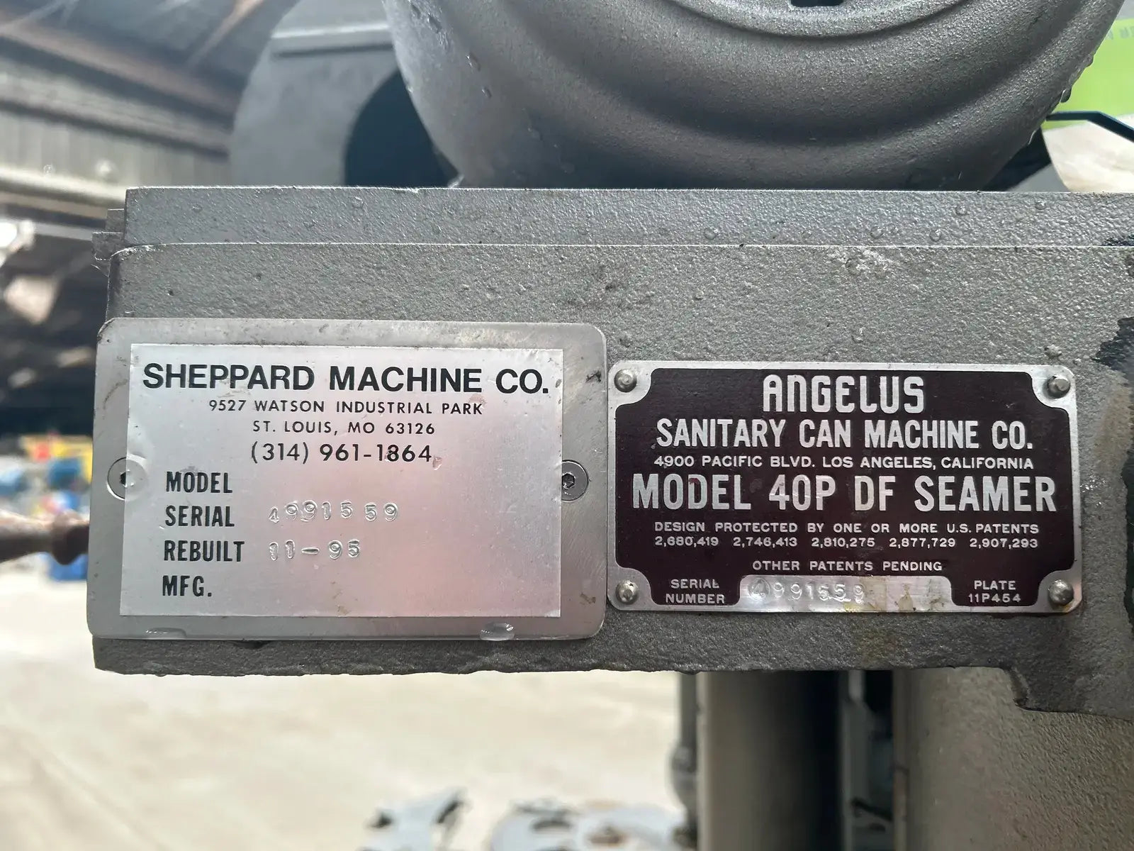 Angelus Sanitary Can Machine Co. Can Seamer, Model 40P DF Seamer. Serial 4991559. Previously rebuilt by Sheppard Machine Co. in 1995, S/N: 4991559. Last ran 204 x 708 cans (2.25 in. x 7.5 in. tall), composite can for refrigerated dough. Note on machine mentions max 180 cans per minute. Overall dimensions: 6.5 ft. x 5 ft. x 6.5 ft. High.