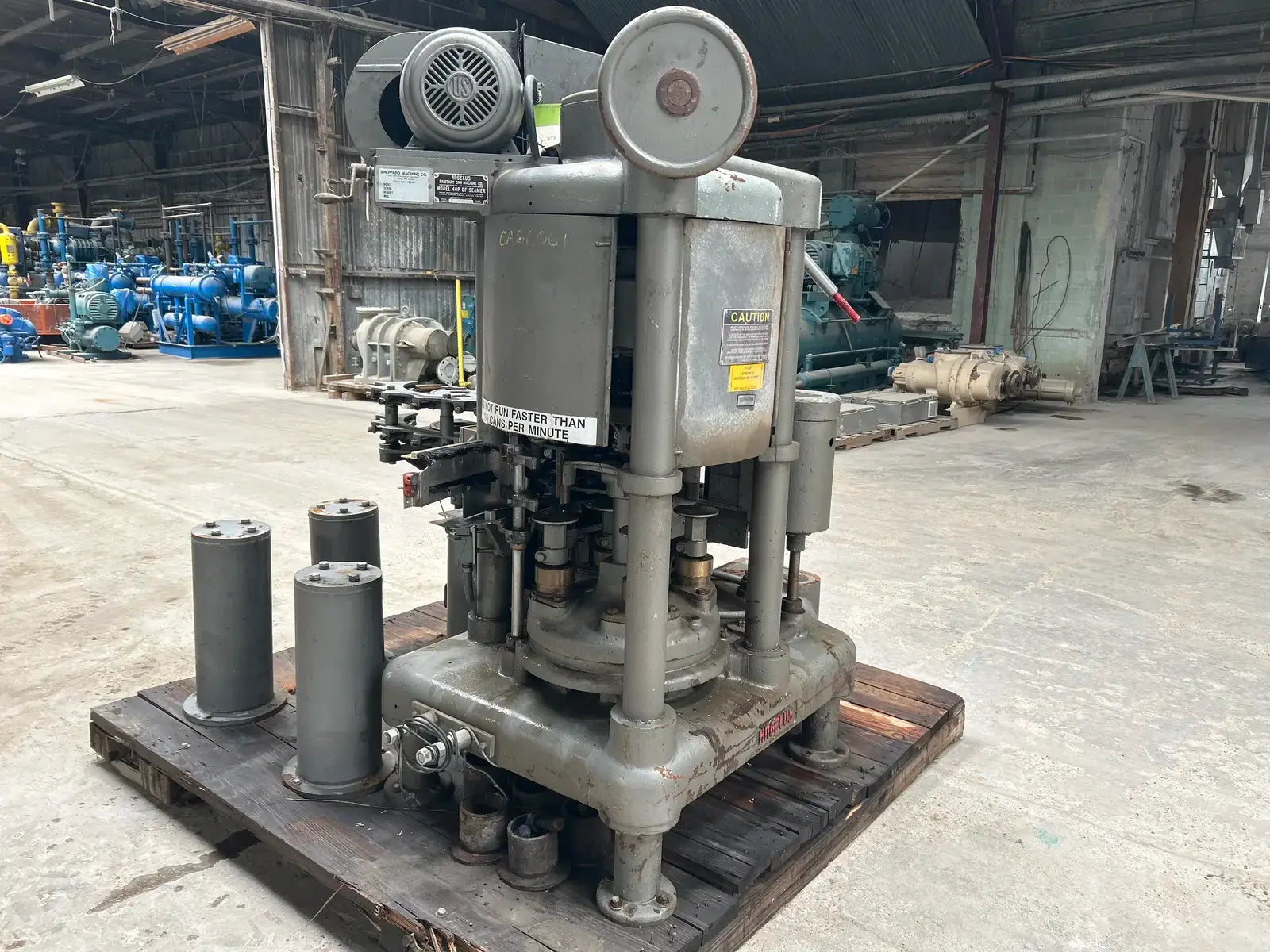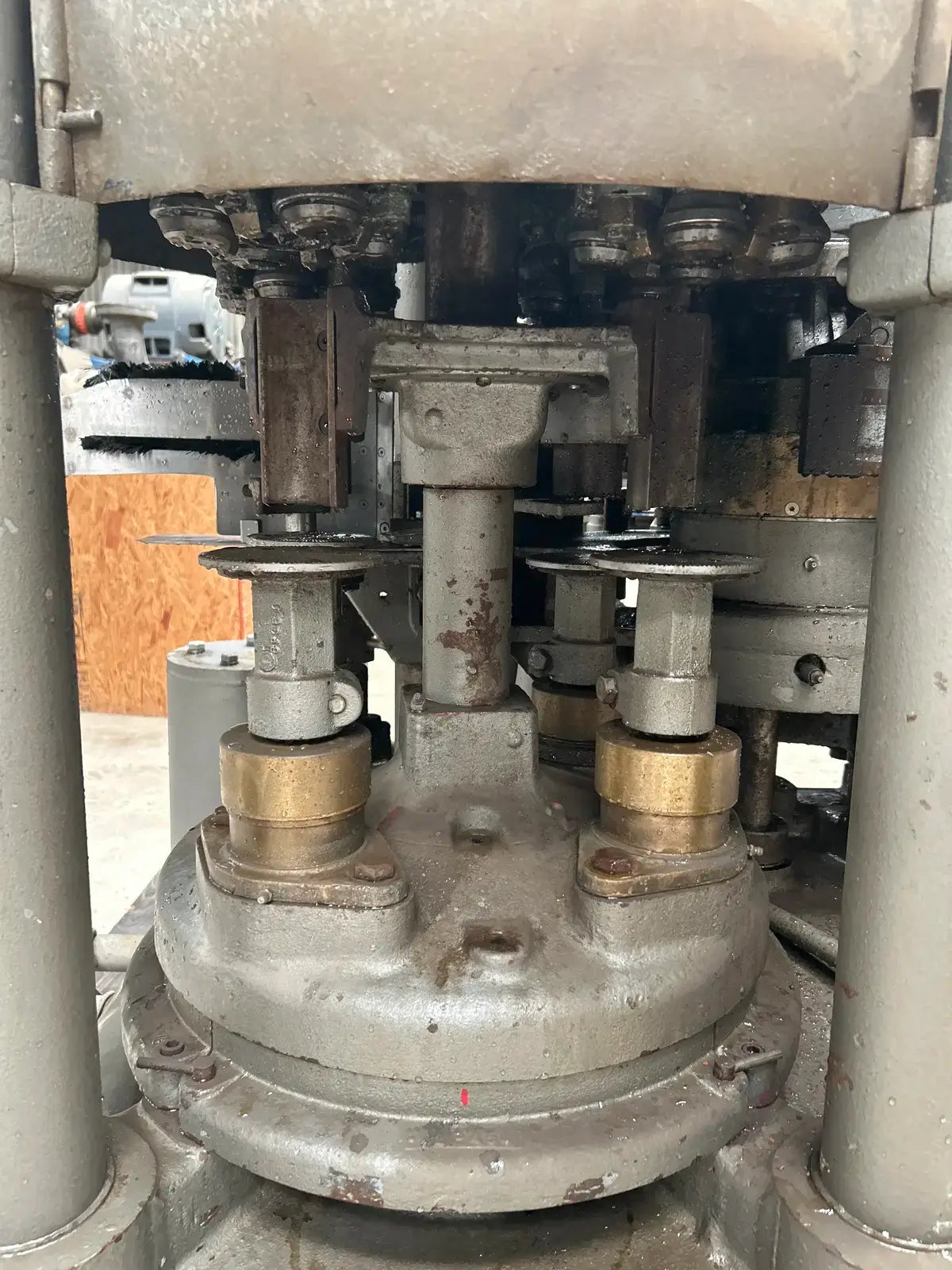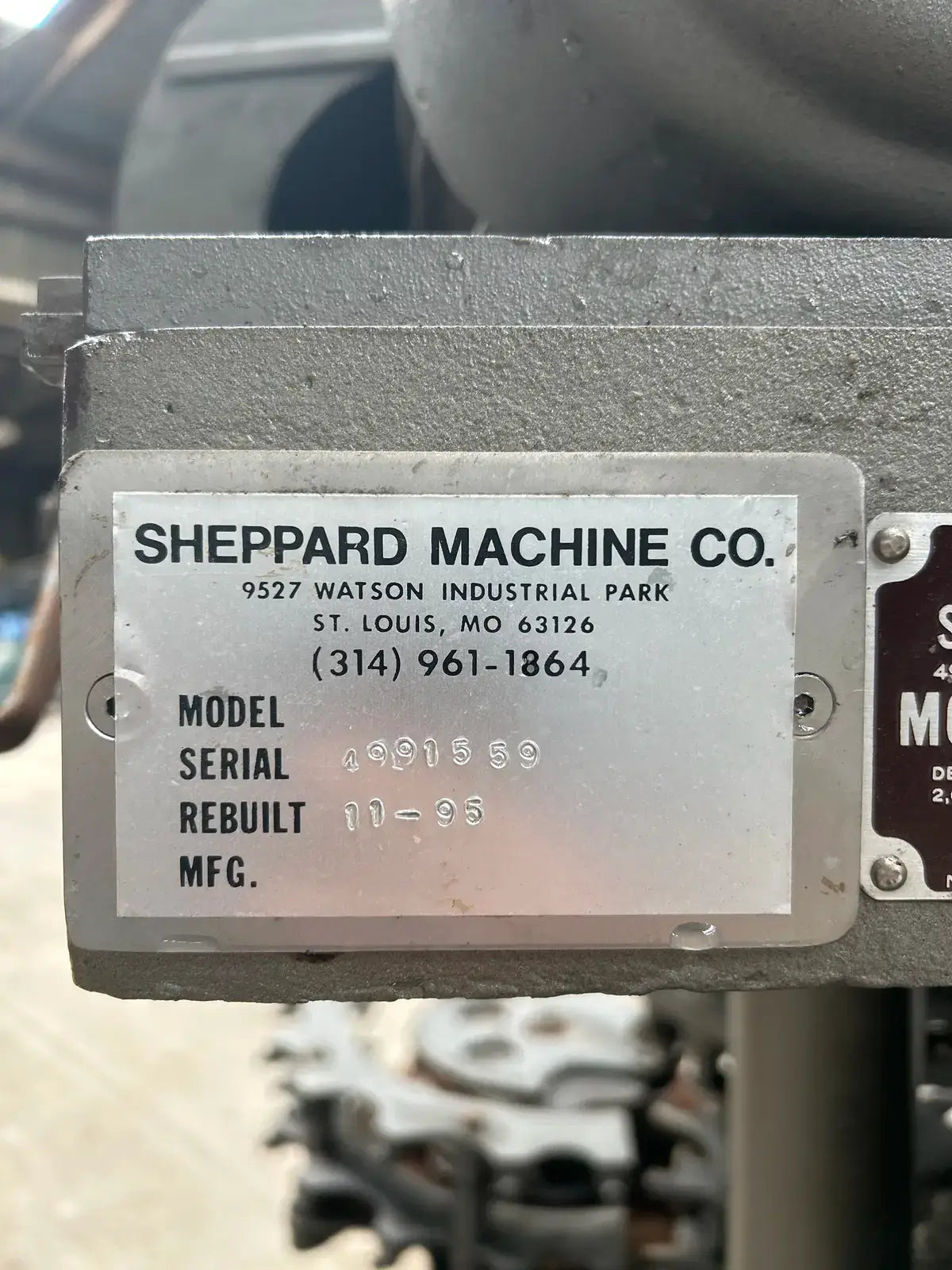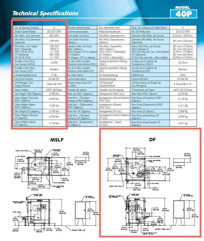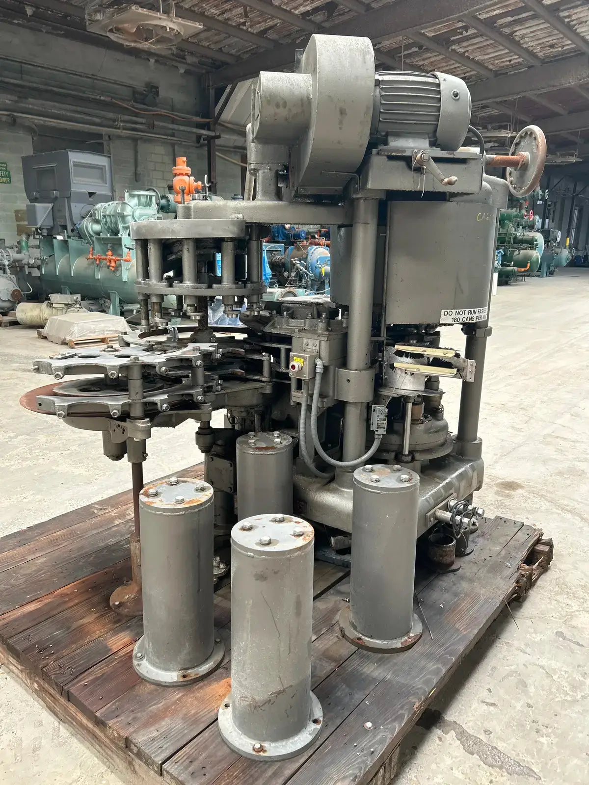 Angelus Sanitary Can Machine Co. Can Seamer, Model 40P DF Seamer. Serial 4991559. Previously rebuilt by Sheppard Machine Co. in 1995, S/N: 4991559. Last ran 204 x 708 cans (2.25 in. x 7.5 in. tall), composite can for refrigerated dough. Note on machine mentions max 180 cans per minute. Overall dimensions: 6.5 ft. x 5 ft. x 6.5 ft. High.