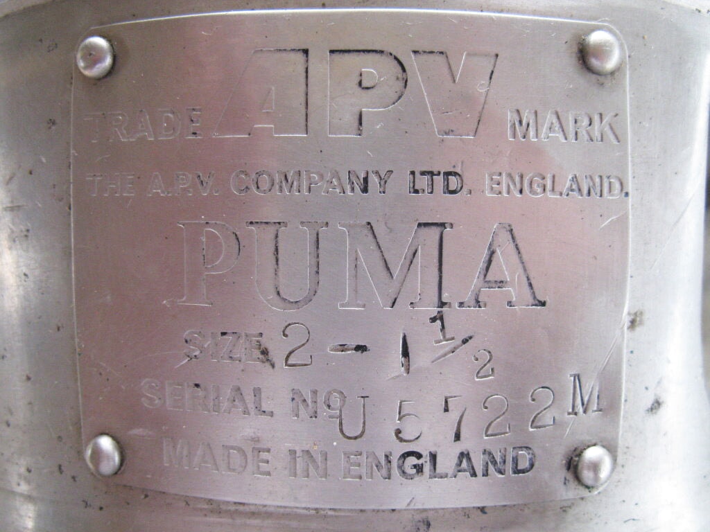 APV Puma Sanitary Centrifugal Pump. Size: 2 - 1 ½. S/N: U5722M. Motor Specifications: 1 Hp, 3450 Rpm, 575 V, 60 Hz, 3 Phase. (1) 4-1/2 in. dia. impeller. Overall dimensions: 1 ft. 10-1/2 in. L x 8-1/2 in. W x 9-3/4 in. H.