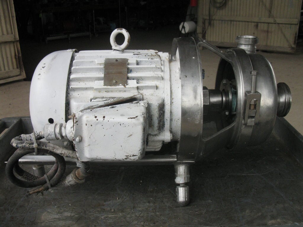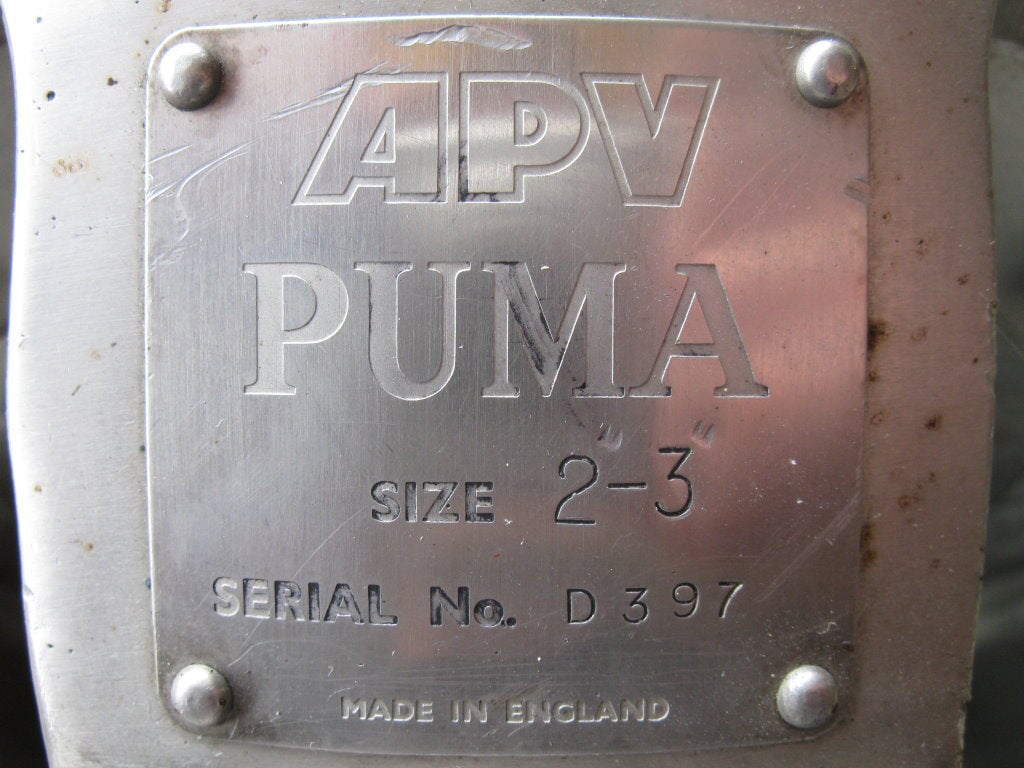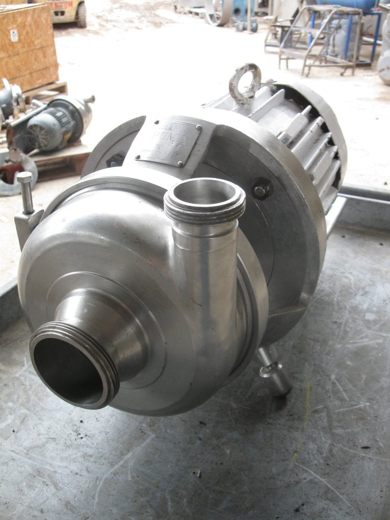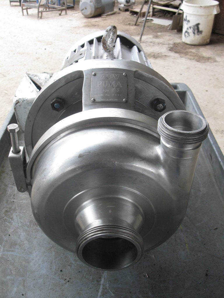 APV Puma Centrifugal Pump. S/N: D397. Size: 2-3-9. Capacity: 160 gpm. Impeller diameter: 5 ½ in. Brook Motor: 5 Hp, 1730 Rpm, 220/440 V, 12.6/6.3 A, 60 Hz, 3 Phase. Inlets: (1) 3 in. dia. ACME fitting. Outlets: (1) 2 in. dia. ACME fitting. Overall dimensions: 2 ft. 4-1/2 in. L x 1 ft. 2 in. W x 1 ft. 4-3/4 in. H.