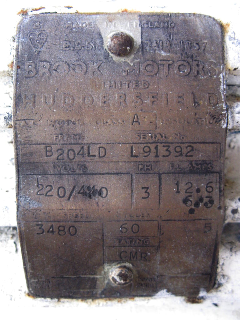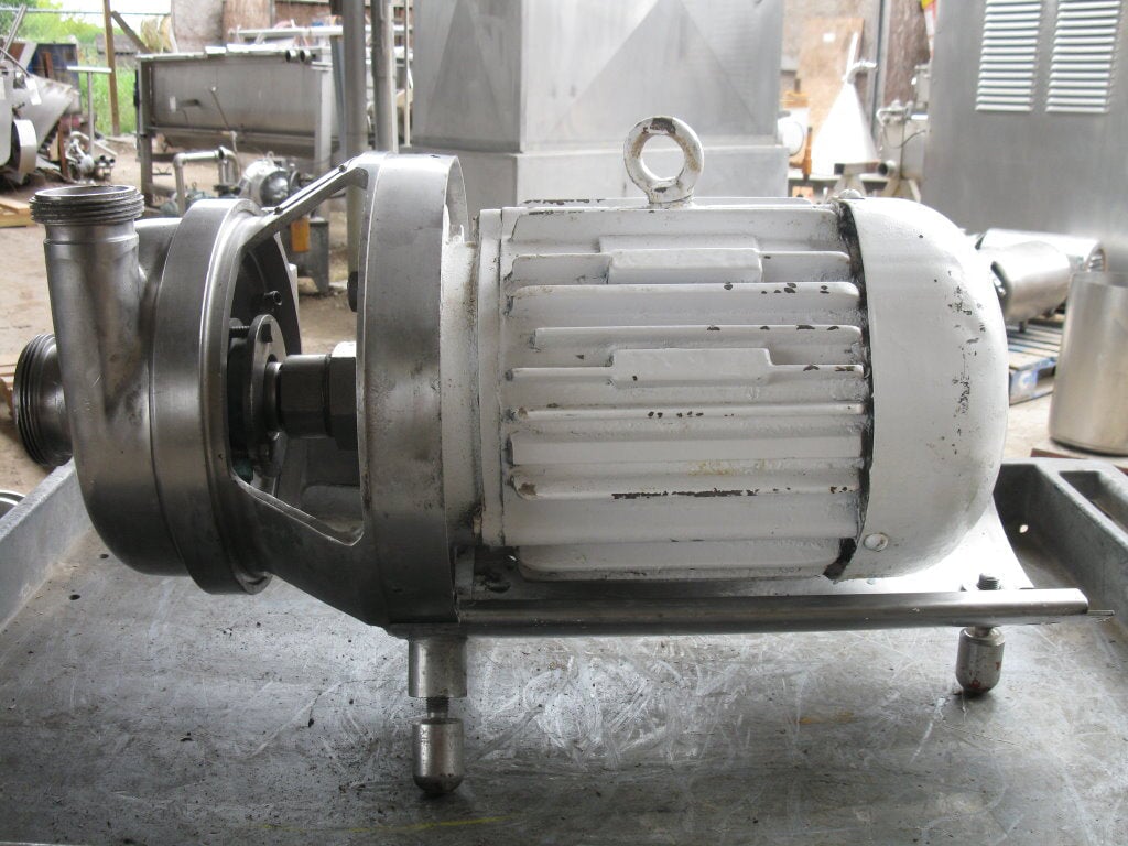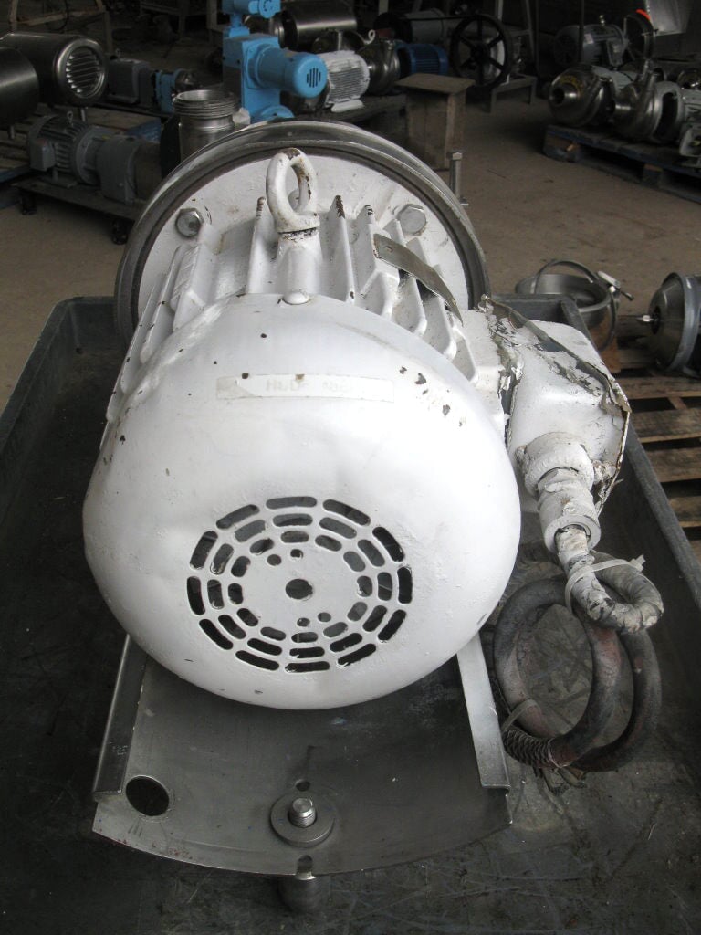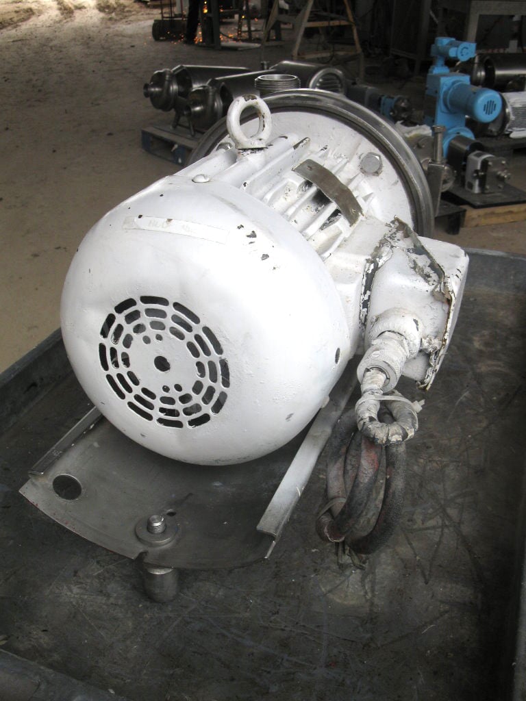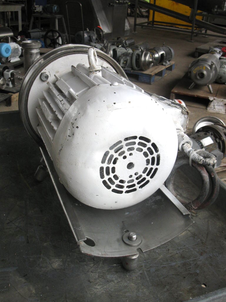 APV Puma Centrifugal Pump. S/N: D397. Size: 2-3-9. Capacity: 160 gpm. Impeller diameter: 5 ½ in. Brook Motor: 5 Hp, 1730 Rpm, 220/440 V, 12.6/6.3 A, 60 Hz, 3 Phase. Inlets: (1) 3 in. dia. ACME fitting. Outlets: (1) 2 in. dia. ACME fitting. Overall dimensions: 2 ft. 4-1/2 in. L x 1 ft. 2 in. W x 1 ft. 4-3/4 in. H.