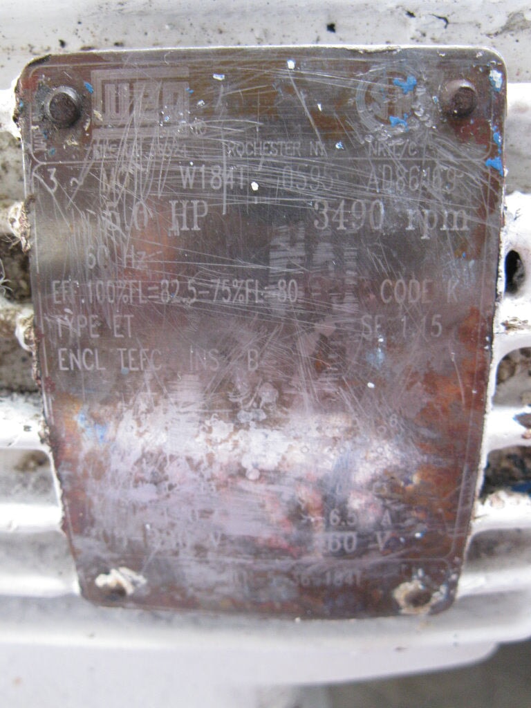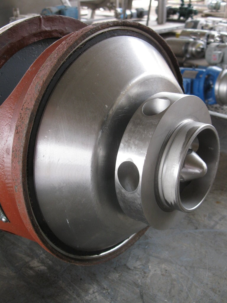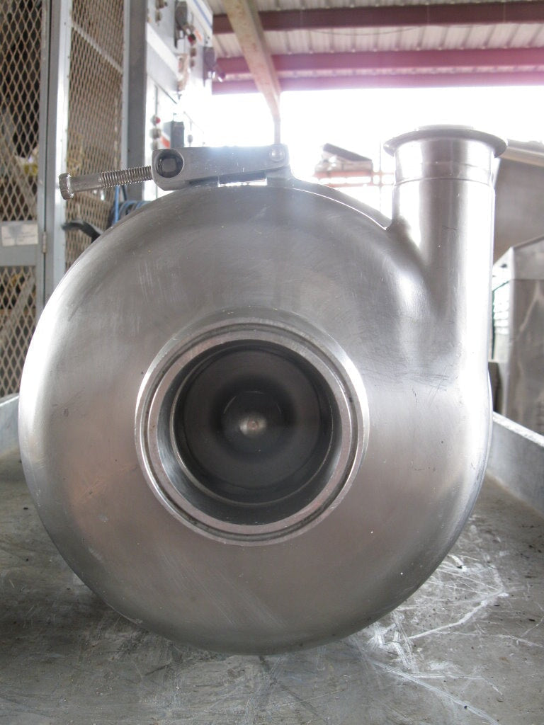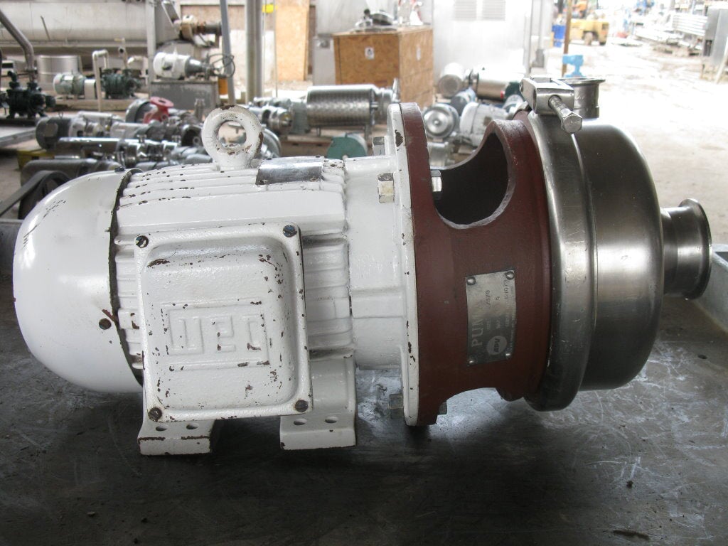 APV Puma Sanitary Centrifugal Pump. S/N: 121079-2. Size: 2/3/9. Discuss with salesperson your process and product to determine if this pump should handle your specific duty. Impeller diameter: 5 in. WEG Electric Motor, 5 hp, 3490 rpm, 208-230/460 V, 13/6.5 amps, 60 Hz, 3 phase. Inlets: (1) 3 in. dia. S-line fitting. Outlets: (1) 2 in. dia. S-line fitting. Overall dimensions: 1 ft. 11 in. L x 1 ft. 1 in. W x 1 ft. 11-5/8 in. H.