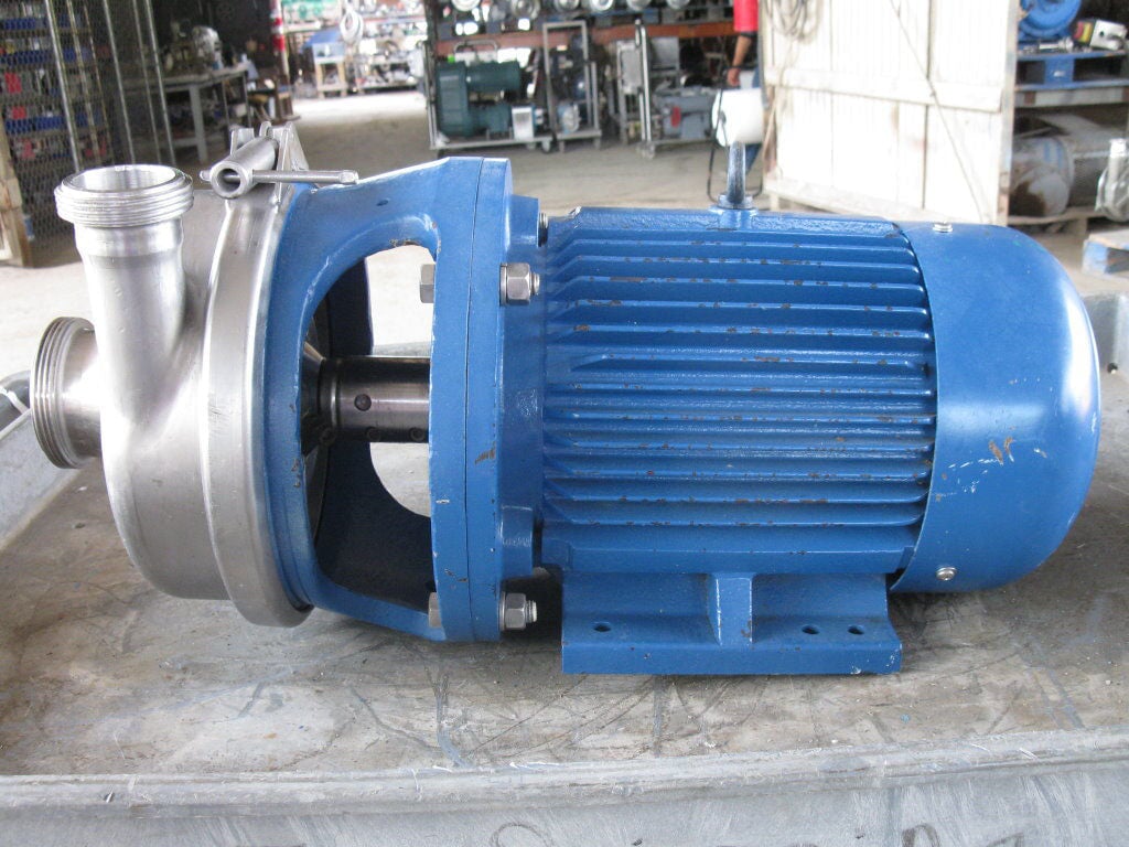 APV Puma Sanitary Centrifugal Pump. Impeller diameter: 5-1/2 in. Leeson Electric Motor, 5 hp, 3510 rpm, 208-230/460 V, 13-12/6 amps, 60 Hz, 3 phase. Inlets: (1) 3 in. dia. ACME fitting. Outlets: (1) 2 in. dia. ACME fitting. Overall dimensions: 1 ft. 11-1/2 in. L x 1 ft. 2 in. W x 11-1/2 in. H.