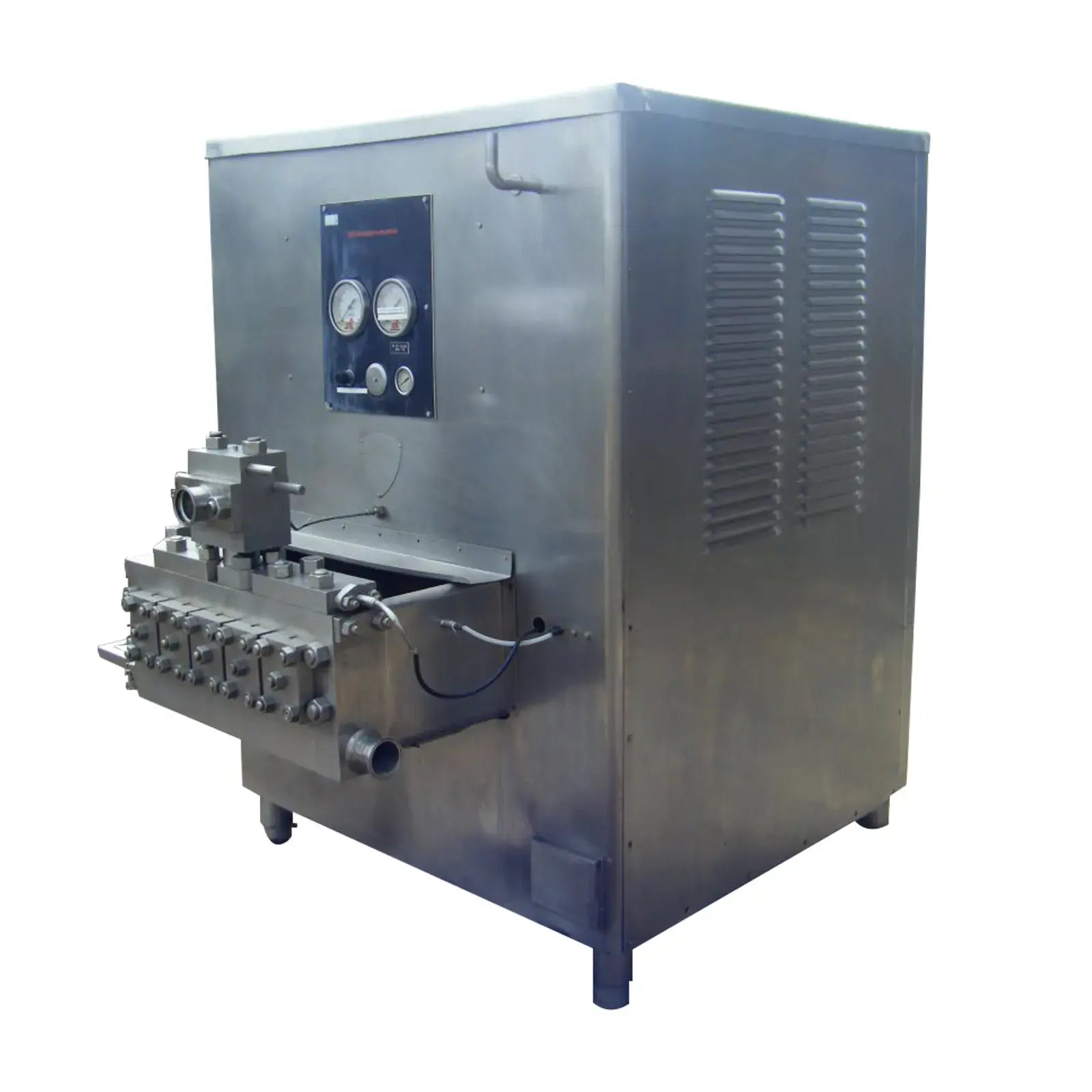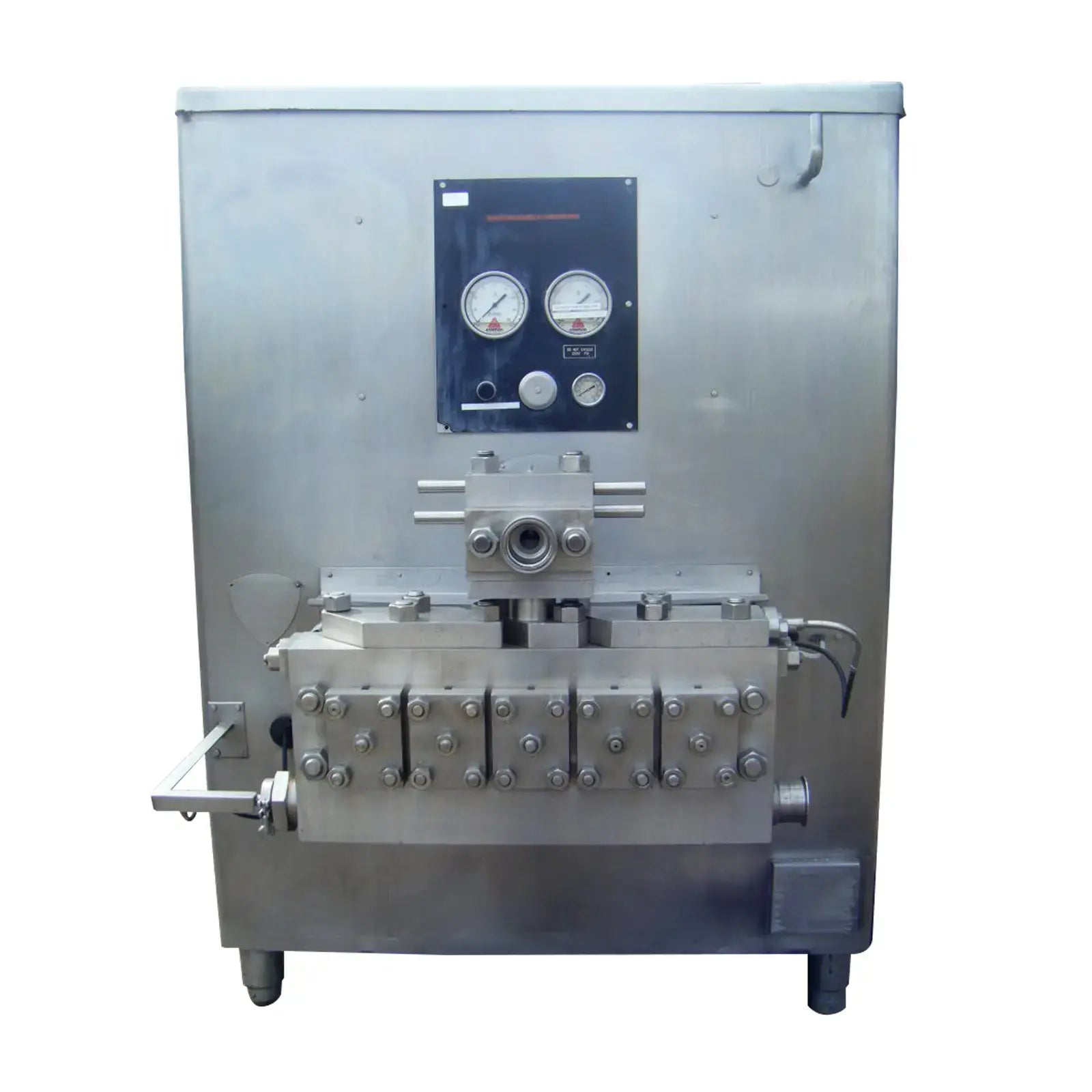 APV Crepaco 5 Cylinder Homogenizer. Model: 5DD775. Rated capacity: 2,430 GPH at 1,600 PSI with (5) 1-3/4 in. dia. plungers. Pressure and flowrate can be modified/adjusted to suit your needs. Pulley dia: 11-3/8 in. driver, 3 ft. 8 in. driven. Maximum PSI: 2500. Lincoln motor: S/N: 1466996, 125 HP, 1185 RPM, 460 V, 154 A, 60 Hz, 3 Phase. Dayton motor: Model: 9ZN53. 1 HP, 1725/1425 RPM, 230/460 V, 3.6/4.0//1.8/2.0 A, 60/50 Hz, 3 Phase. Inlets/outlets: (2) 3 in. S-line. (1) 1 in. port. Overall dimensions: 7 ft. 1 in. L x 4 ft. 10-1/2 in. W x 6 ft. 9-1/2 in. H.