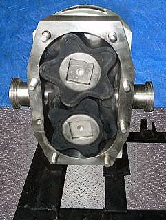 APV Crepaco R-Series Positive Displacement Pump. Model: R4R. S/N: B-6212. Capacity: 55 gpm. Displacement per Revolution: 0.175 gal. Final rpm: 367 rev/min. Maximum speed: 900 rpm. Toshiba Electric Motor, 5 hp, 1,715 rpm, 230/460 V, 13.0/6.5 amps, 60 Hz. The "R" Series pumps incorporate stainless steel bodies with versatile, resilient, molded rotors and a heavy cast iron gear case. Inlets: (1) 2 ½ in. dia. Acme threaded fitting. Outlet: (1) 2 ½ in. dia. Acme threaded fitting. Overall dimensions: 3 ft. 5 in. L x 1 ft. 10 ½ in. W x 2 ft. 5 in. H.