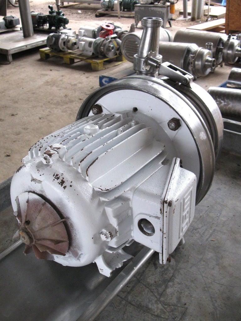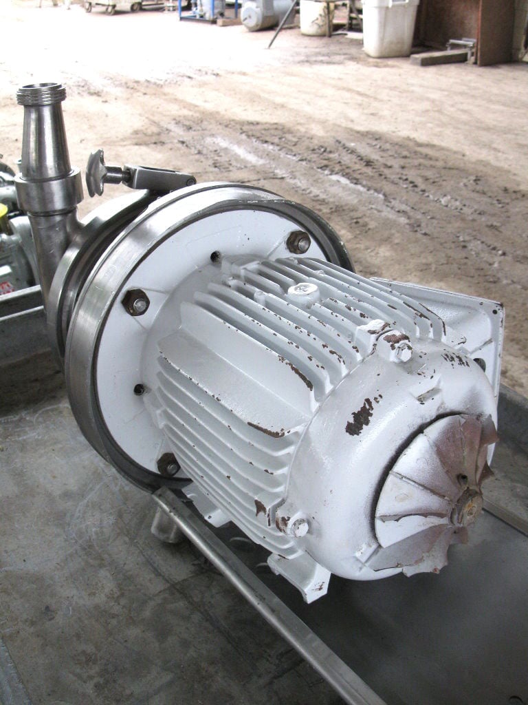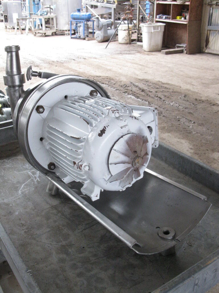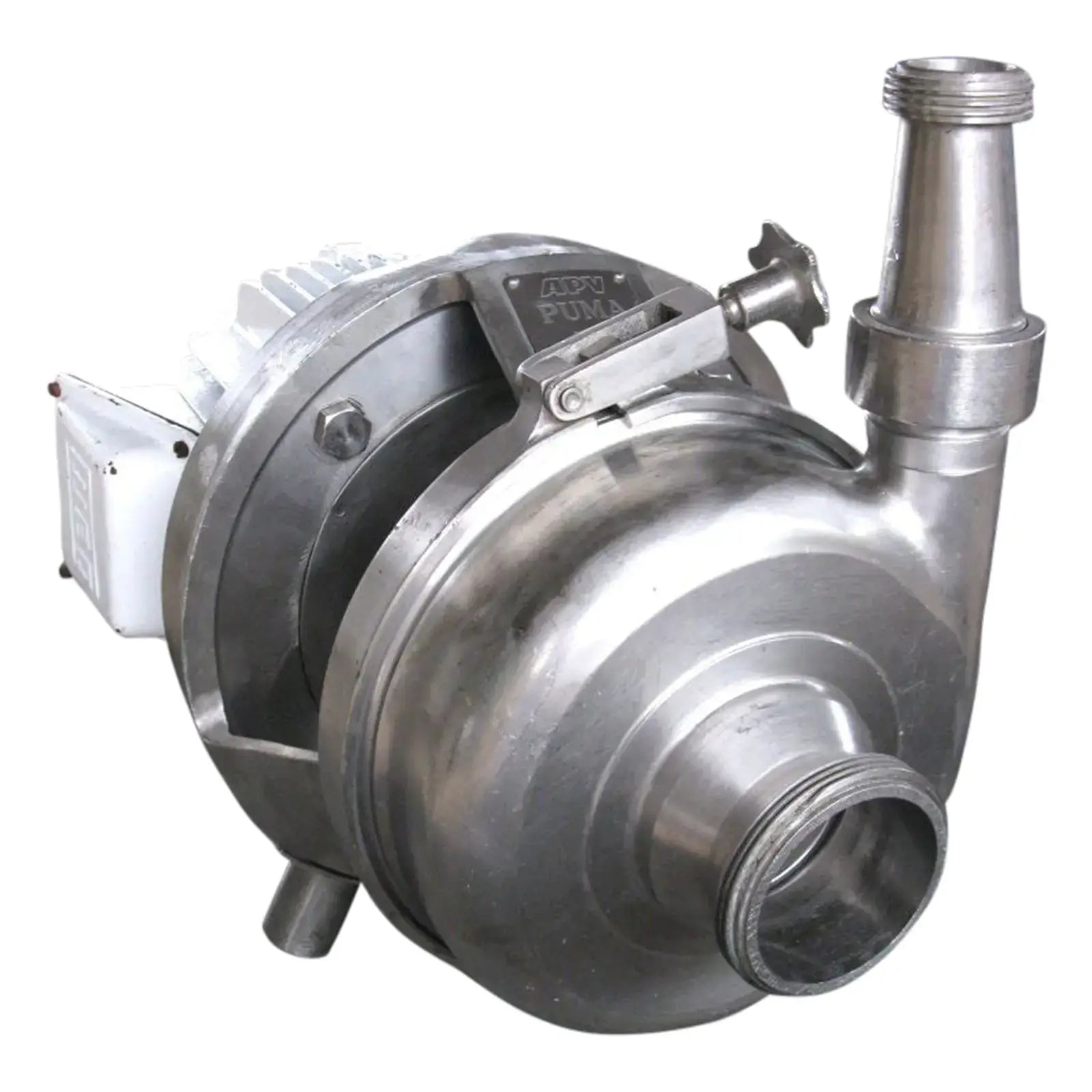 APV Puma III Series Sanitary Centrifugal Pump. Model: Puma III. Size: 2-3. S/N: D398. Nominal Capacity: 240 gpm @ 28 psi. Displacement per revolution: 0.068 gal. Maximum speed: 3500 rpm. Impeller diameter: 4-3/4 in. Discuss with salesperson your process and product to determine if this pump should handle your specific duty. The APV Puma III is designed for use in open work areas adjacent to dairy, food, beverage, and industrial plant processing operations. Inlet: (1) 3 in. dia. ACME fitting. Outlet: (1) 1 ½ in. dia. ACME fitting. Overall dimensions: 2 ft. 5 in. L x 1 ft. 2 in. W x 1 ft. 4-5/8 in. H.