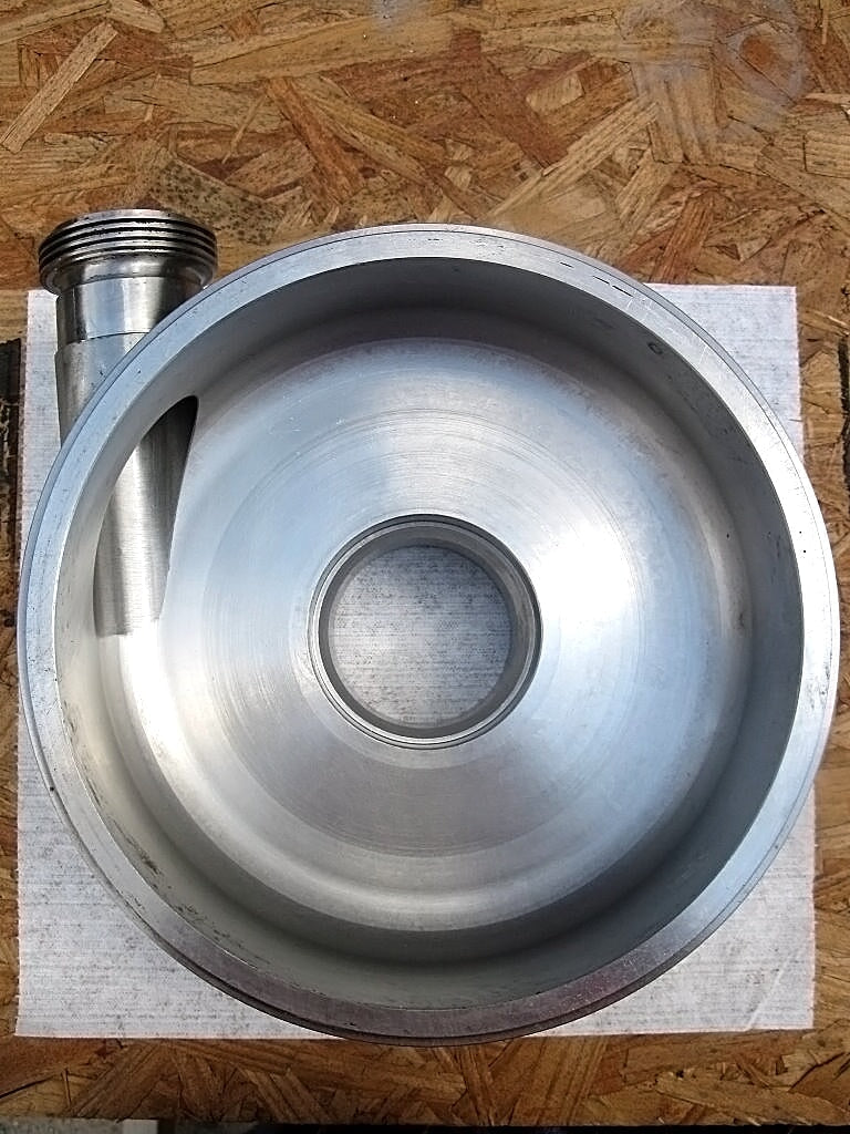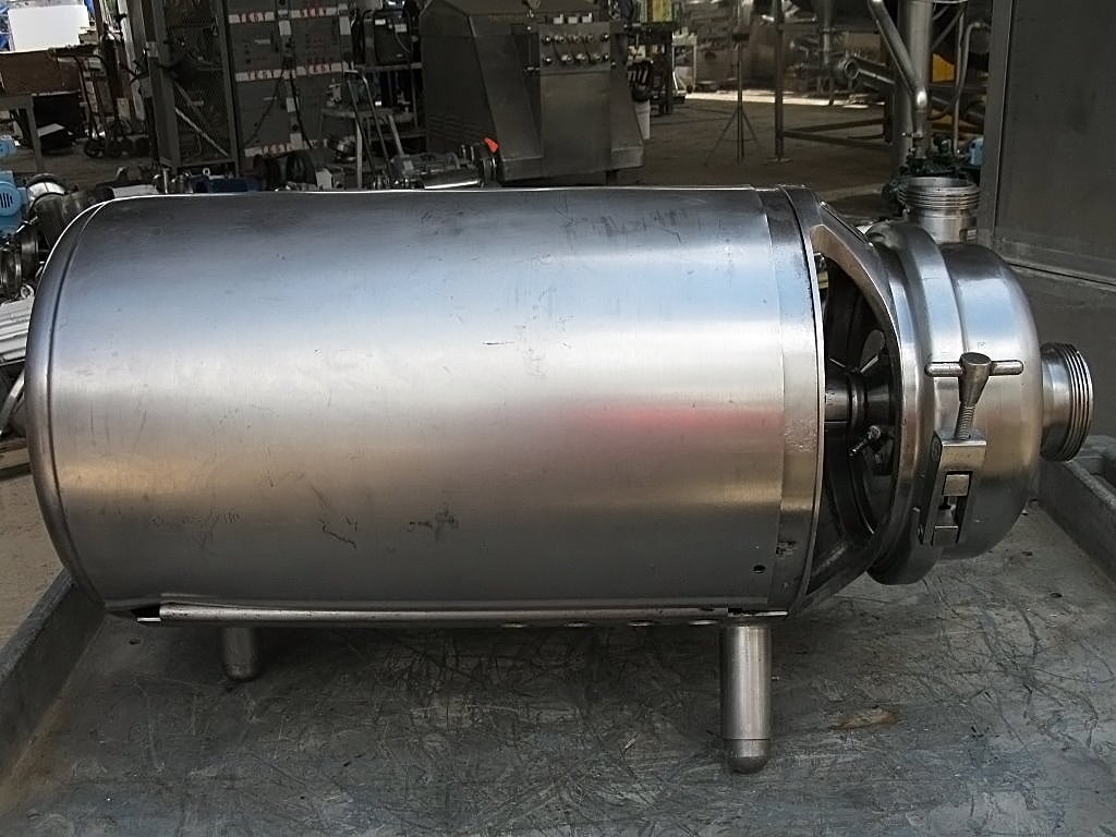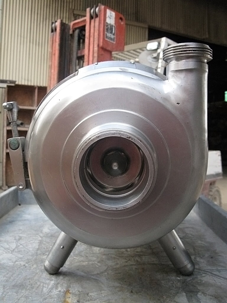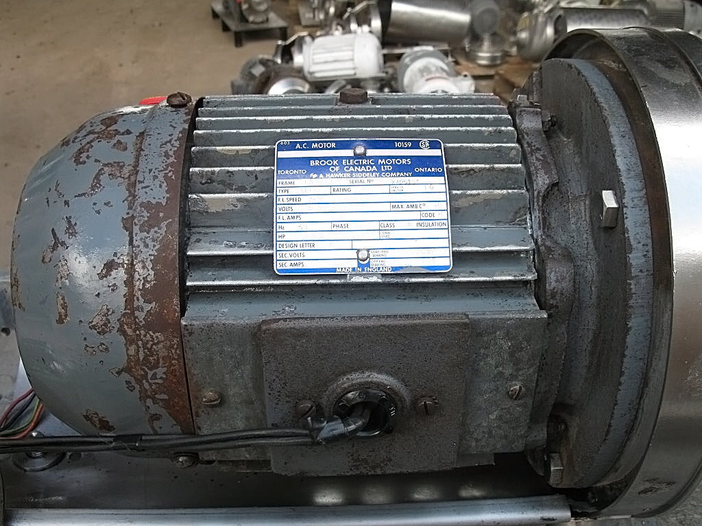 APV Puma Centrifugal Pump. Model: III. S/N: U2220M. Impeller diameter: 5 in. Brook Electric Motor, 5 hp, 3450 rpm, 575 V, 5.2 A, 60 Hz, 3 phase. Inlets: (1) 3 in. dia. ACME fitting. Outlets: (1) 2 in. dia. ACME fitting. Overall dimensions: 2 ft. 5 in. L x 1 ft. 1/2 in. W x 1 ft. 4 in. H.