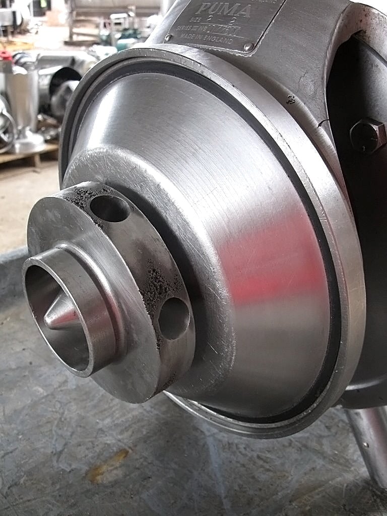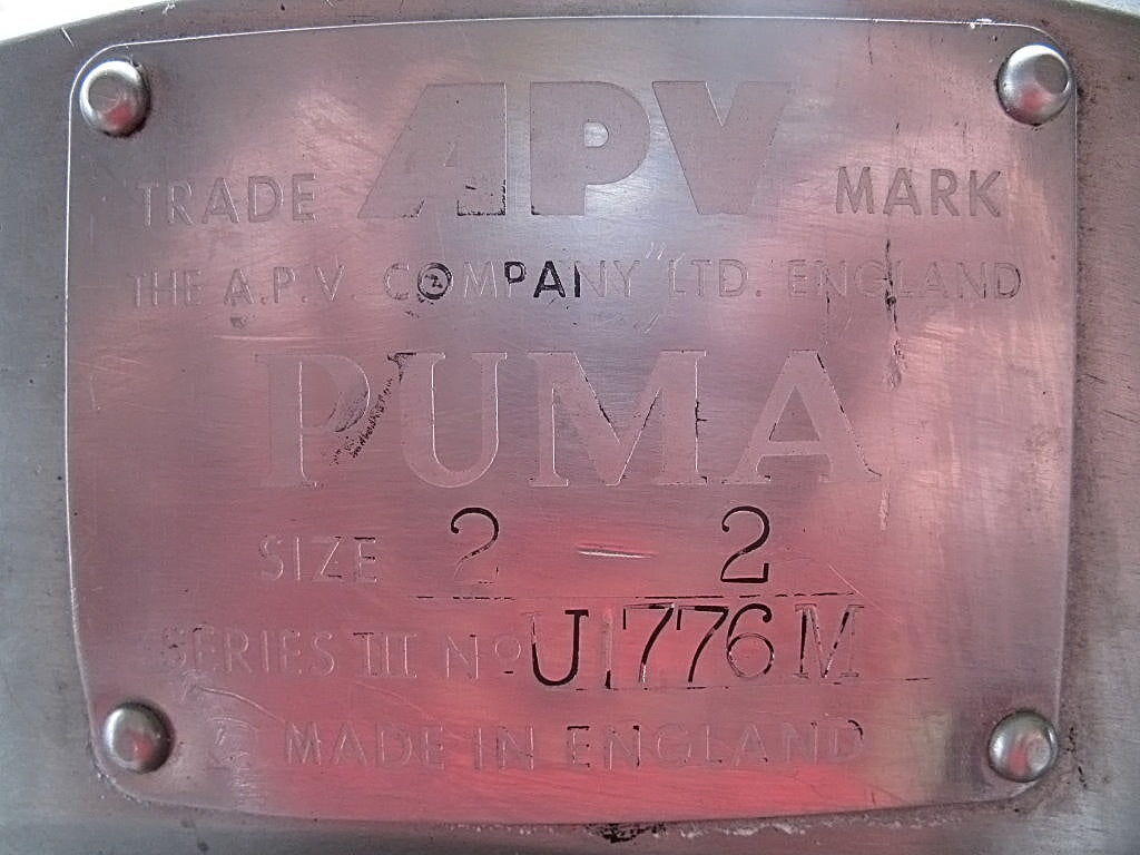 APV Puma Centrifugal Pump. Model: III. S/N: U1776M. Size: 2-2. Impeller diameter: 5 in. Inlet: (1) 2 in. dia. ACME fitting. Outlet: (1) 2 in. dia. ACME fitting. Overall dimensions: 2 ft. 4-1/2 in. L x 1 ft. 1/2 in. W x 1 ft. 4 in. H.