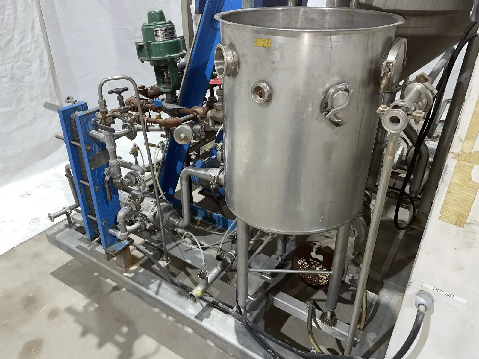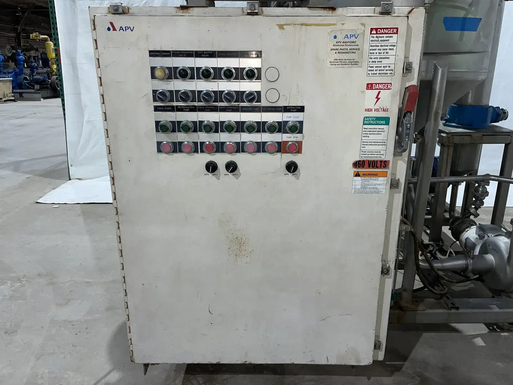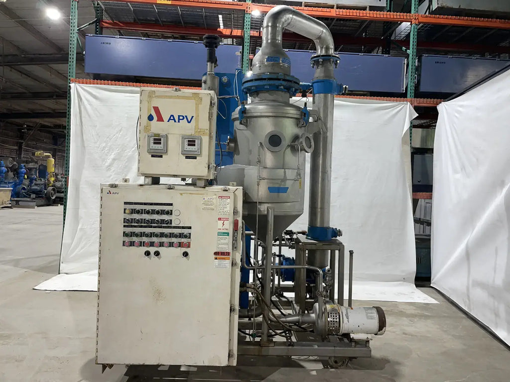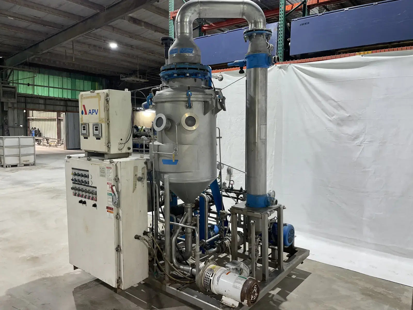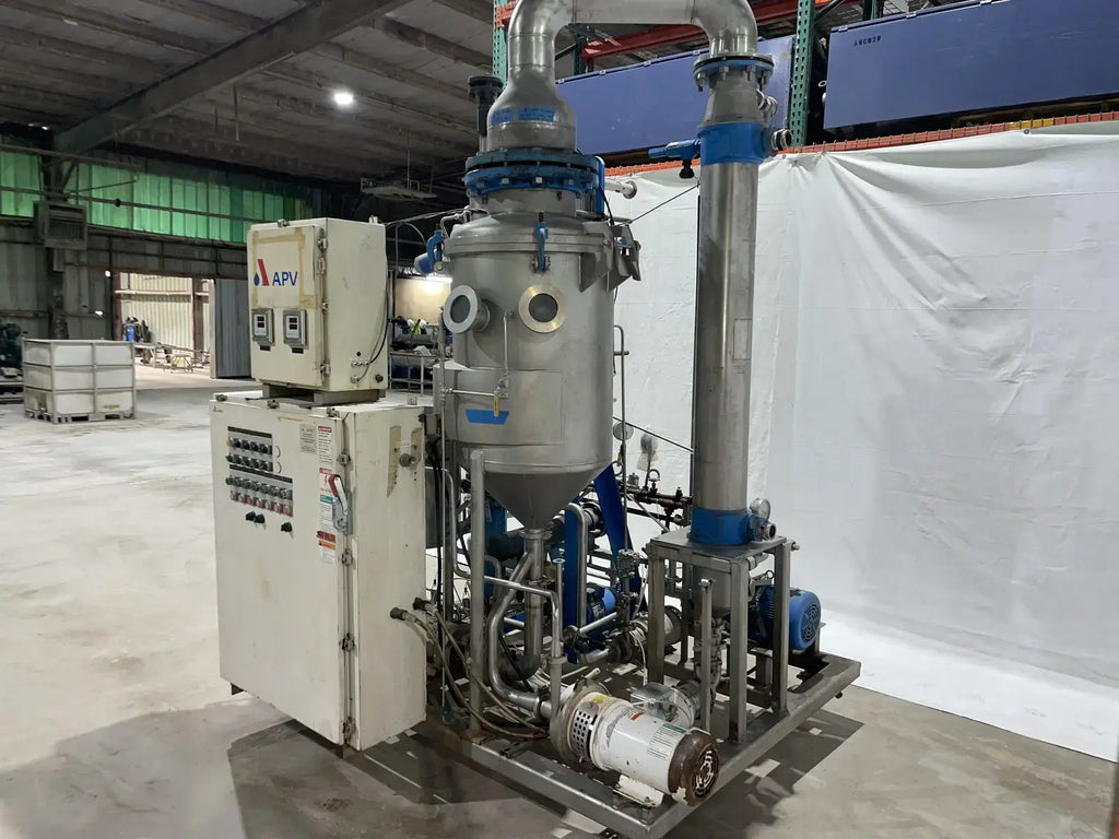 APV Junior (JR) Single Effect Evaporator Skid. Estimated water removal rate: 250-500 LBS/HR. Estimated weight: 4,200 LBS. Dimensions: 94 in. x 92 in. x 10 ft. high.