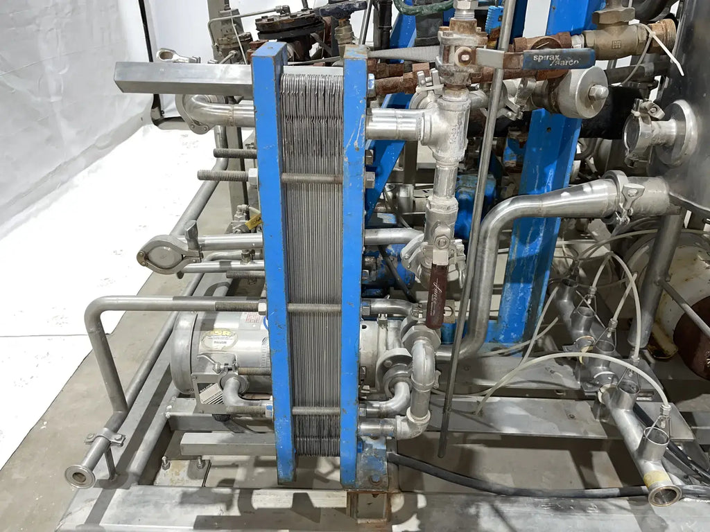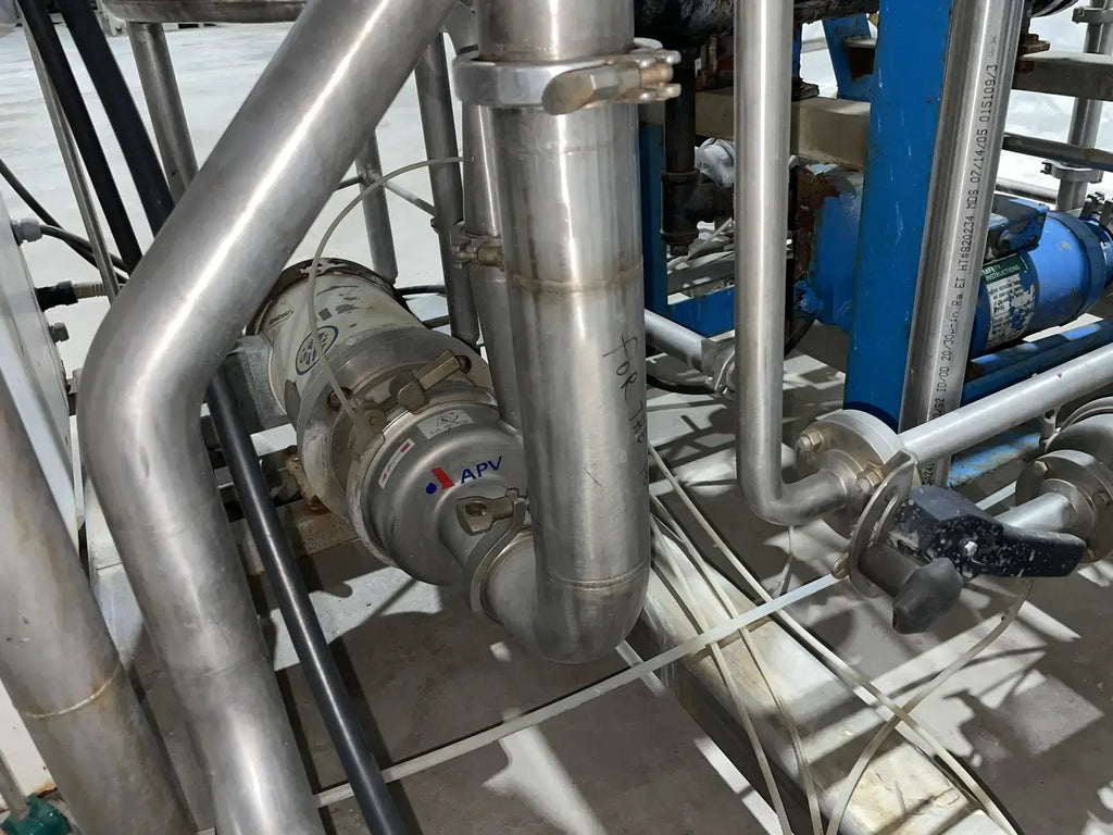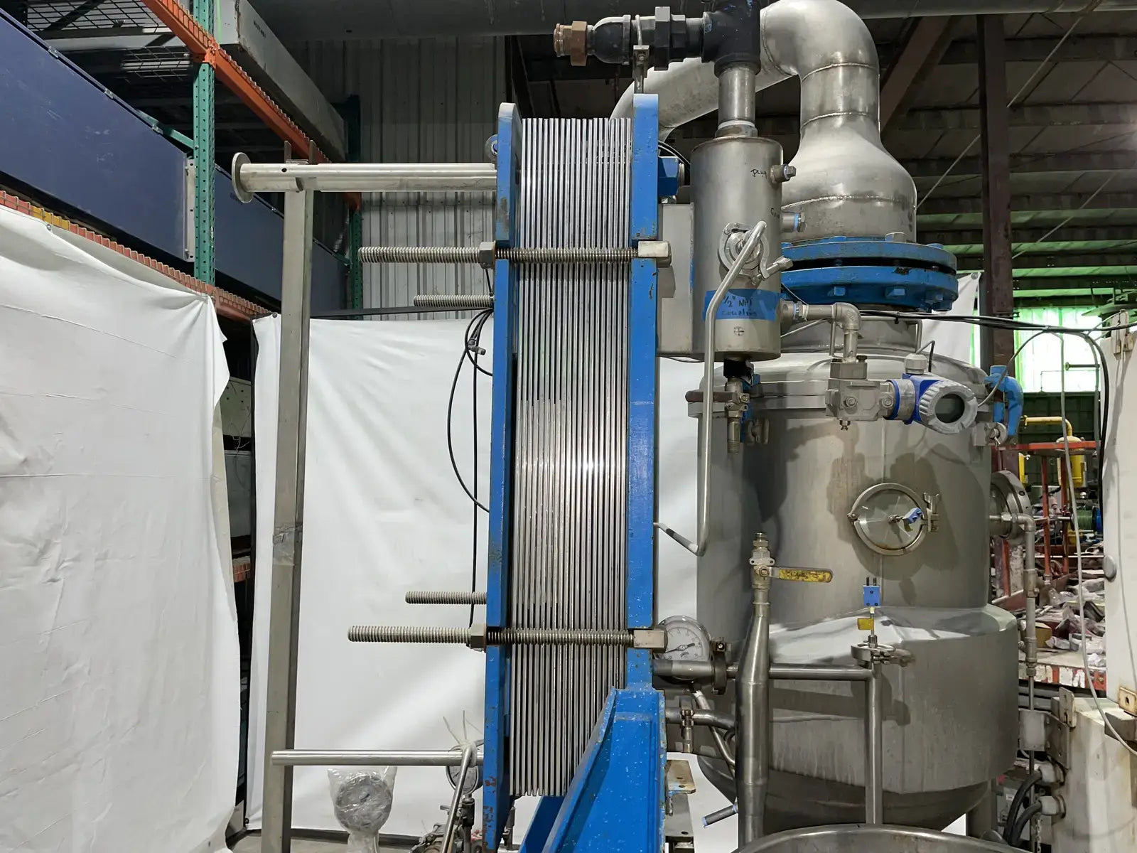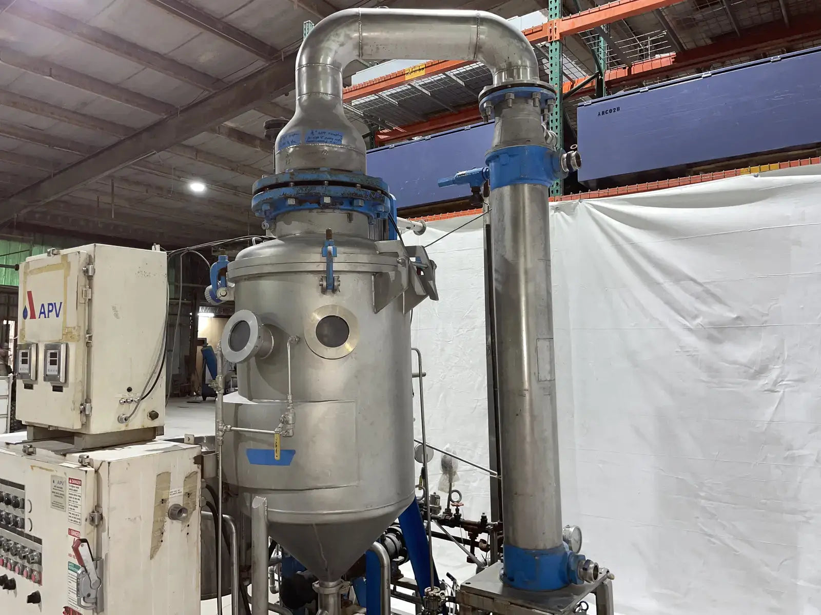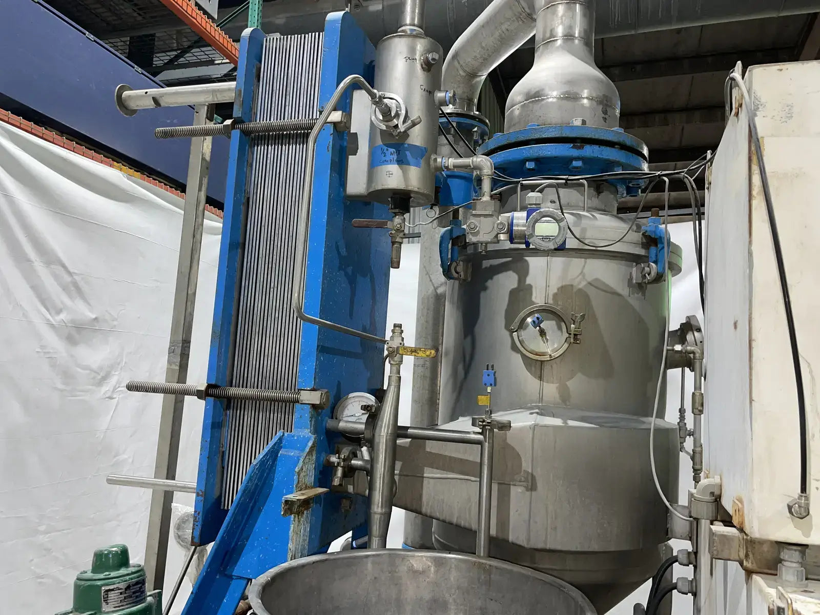 APV Junior (JR) Single Effect Evaporator Skid. Estimated water removal rate: 250-500 LBS/HR. Estimated weight: 4,200 LBS. Dimensions: 94 in. x 92 in. x 10 ft. high.