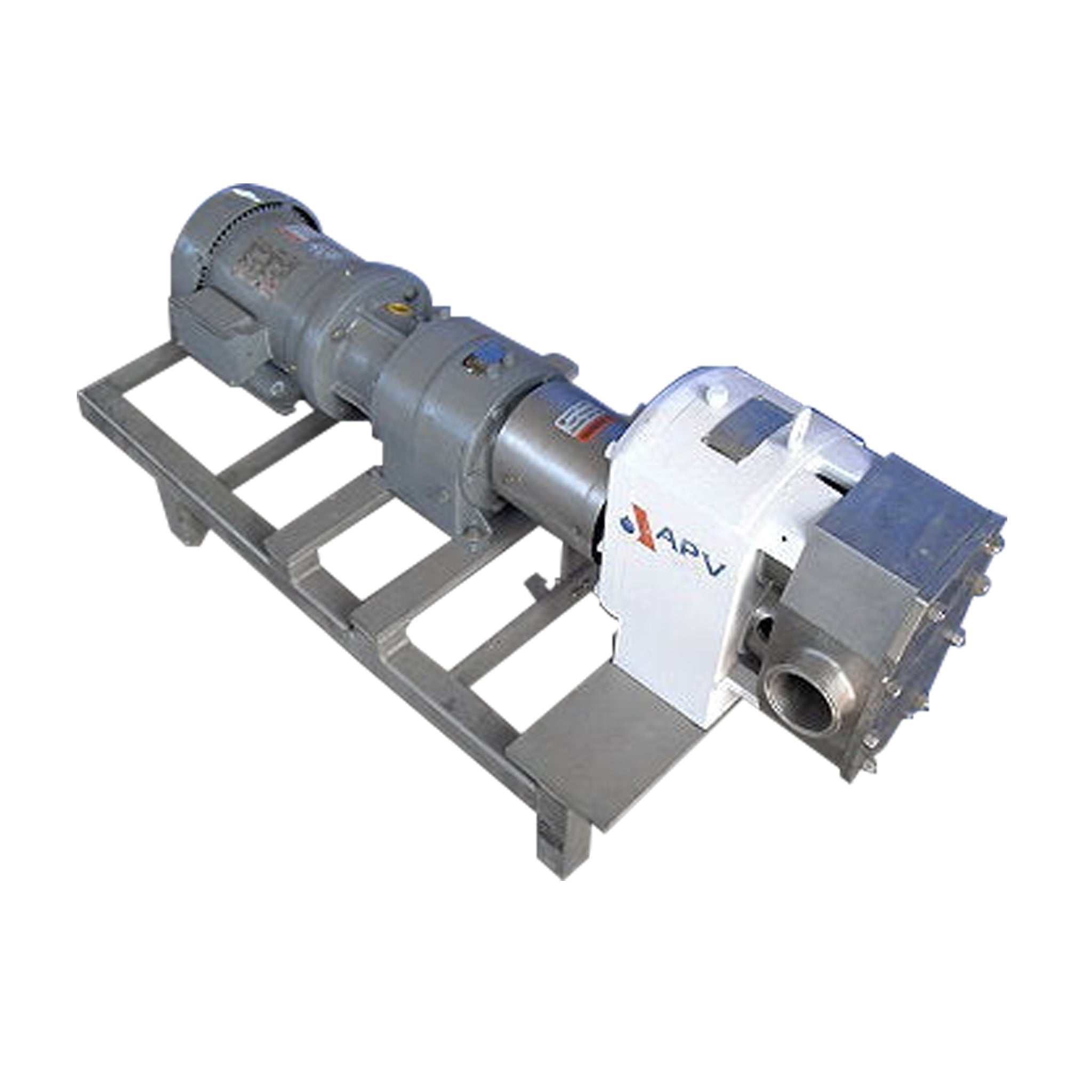 APV Positive Displacement Pump. Model: 6R+BS. Flow rate for new pump is 260 gpm with required horsepower and pressure. Discuss with salesperson your process and product to determine if this pump should handle your specific duty. U.S. Electrical Motors Co. 5 hp, 1750 rpm, 208-230/460 v, 14.2-12.8/6.4 a, 60 Hz, 3 phase. Dodge APG drive: 10 in hp, 230.26 out rpm, 2630 torque, 7.600 ratio. (2) 5-5/8 in. rubber lobe rotors. Stainless steel base mounted. Inlet/outlet: (2) 3 in. S-line. Overall dimensions: 4 ft. 4 in. L x 1 ft. 11 in. W x 2 ft. 1 in. H.(ACN133).