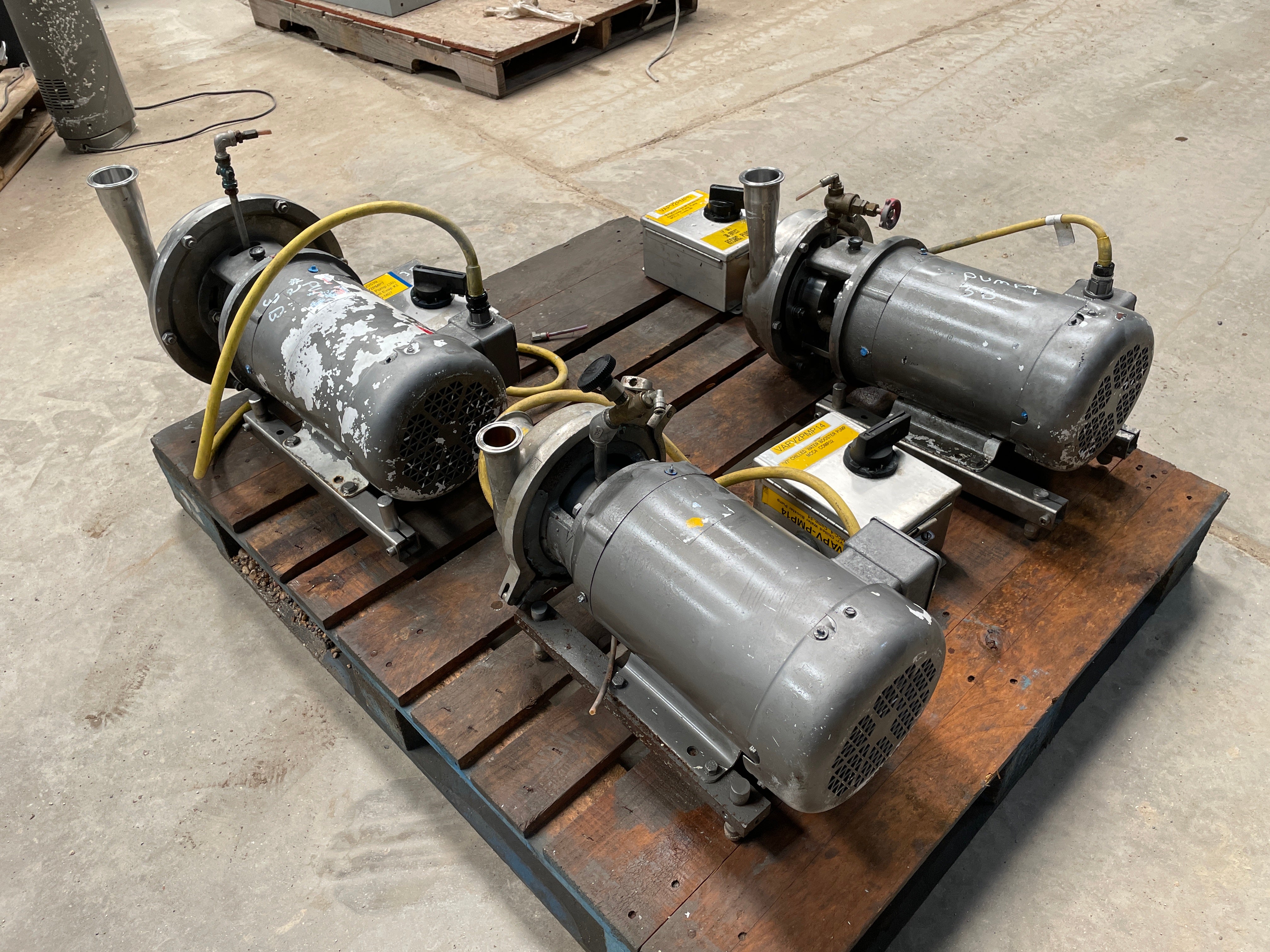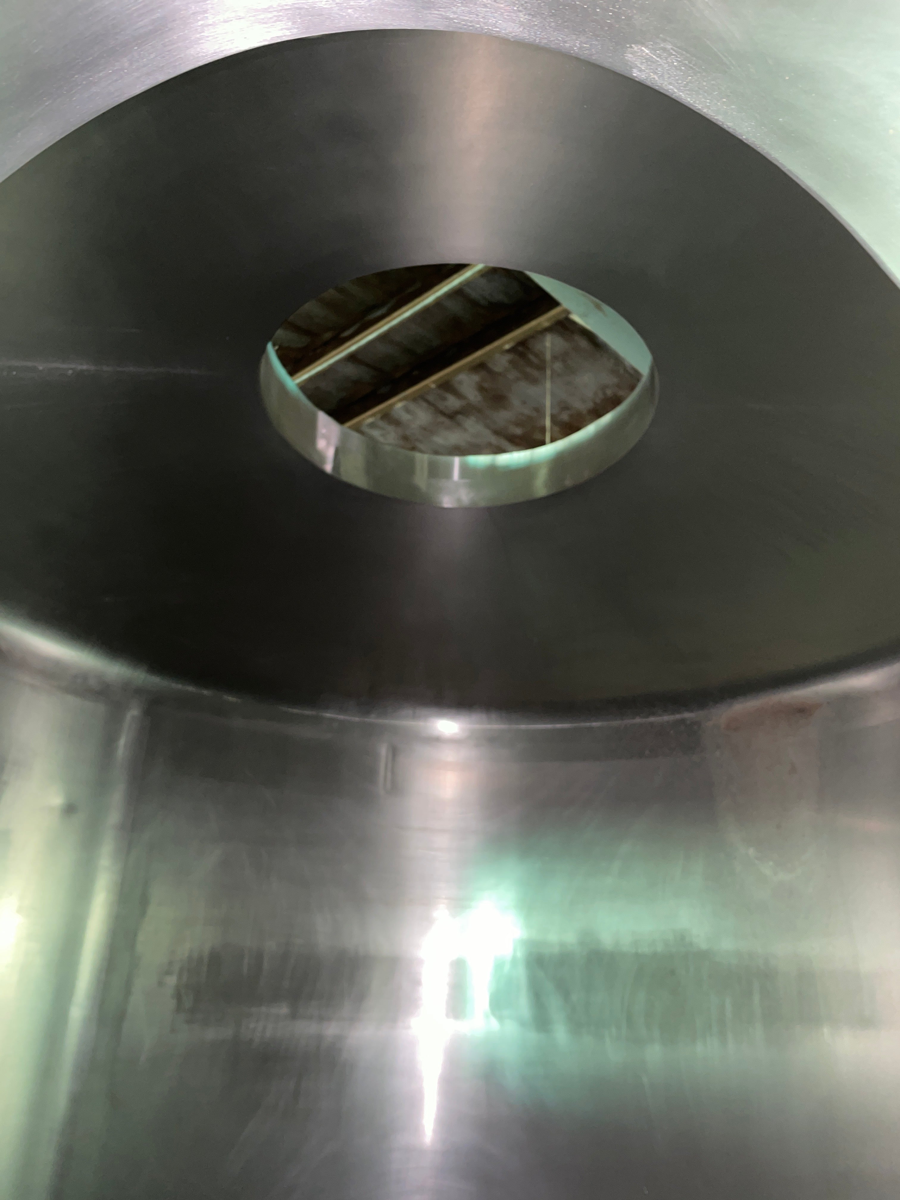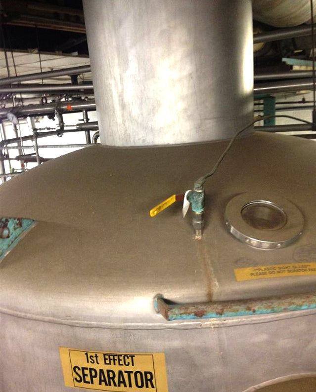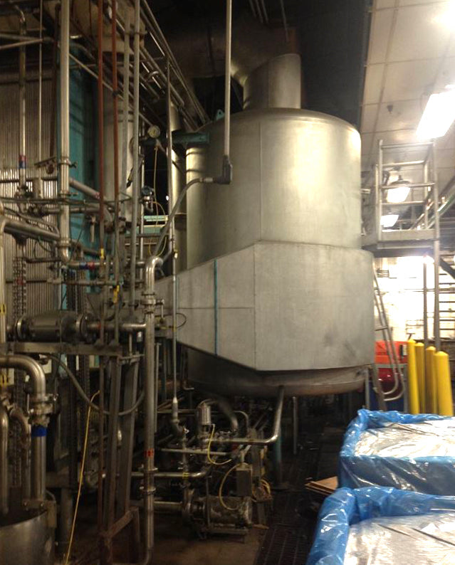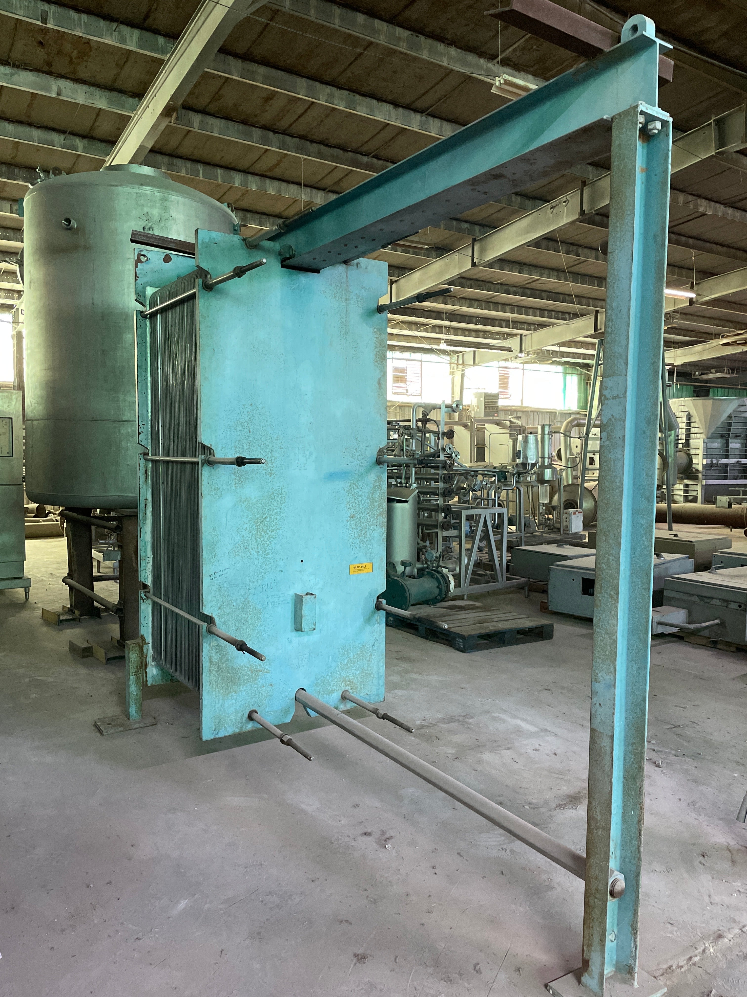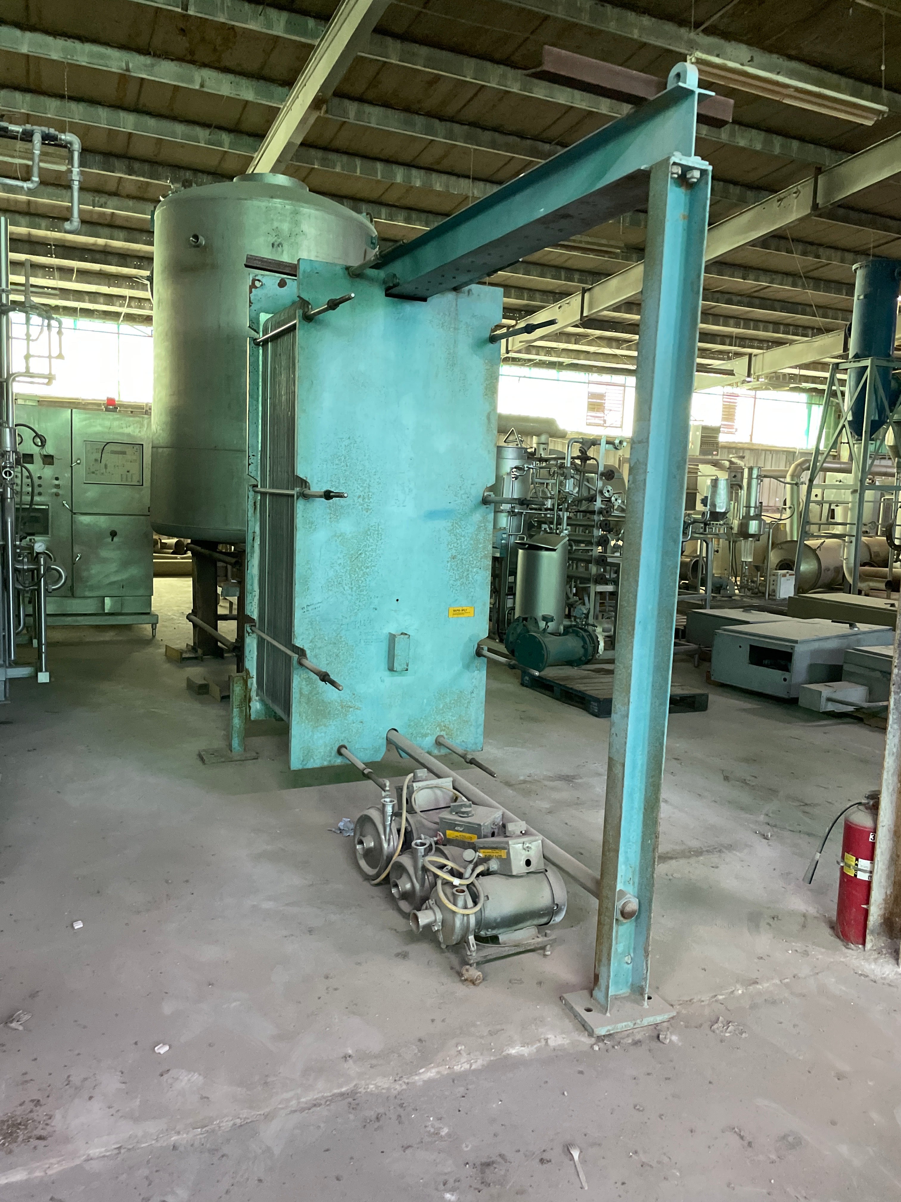 APV Falling Film Evaporator with vapor separator tank, and centrifugal pumps. Not included: controls, valves, product tubing, condenser, etc. Footprint: 12 ft. 3 in. Long x 4.5 ft. W (Frame), 80 in. W x 96 in. L (vessel).