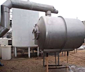 APV Single-Effect Rising / Falling Film Plate Evaporator. Model: P-E. S/N: 1247. All product contact surfaces are 316 stainless steel including heat exchanger plates, vapor separators, pumps, vapor and product tubing. This system was last running citrus juices and will be able to run most other types of juice or liquid products. Inlets: (2) 2 in. dia. ACME fittings (product), (1) 4 in. W x 30 in. H steam port. Outlets: (1) 2 in. dia. condensate port, (1) 21 in. W x 10 ½ in. H vapor port. Overall dimensions: 7 ft. L x 2 ft. 11 in. W x 8 ft. H. First Effect Horizontal Separator - 500 Gallon. S/N: 20423, vacuum: 28.54 in. Hg. Inlets: (1) 1 ½ in. dia. S-line fitting (sprayball), (1) 21 in. W x 10 ½ in. H vapor port. Outlets: (1) 4 in. dia. ACME fitting, (1) 15 in. dia. vapor pipe. Overall dimensions: 6 ft. 9 in. L x 4 ft. 8 in. H x 7 ft. 1 in. H.
