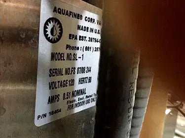 Aquafine Ozone Destruction Unit with ultraviolet lamp. Model: SL-1. Serial: FS 07/08 244. Electrical: 120V / 60 Hz / 0.51 amps. P/N: 18454. Also includes IN-USA Mini-SCI sensor control interface, sanitary control valve, and stainless steel Frame. Overall dimensions: 4.5 x 4 x 1.5 (feet).