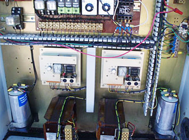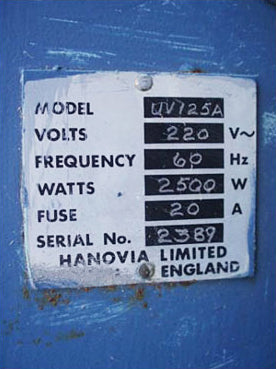 Aquionics Inc. UV System. Model: UV125A. S/N: 2389. Power supply: 220 V, 60 Hz, 2500 watts. (2) Hanovia UV Monitors, S/N: 465. (2) Hanovia Transformers, type: 1KW, Primary V: 220/240, Secondary V: 380/420, KVA Nom: 1.26, 60 Hz, single phase. (2) Biprol Impregnated Capacitors, max rated current: 50 amps, 500 Vrms. Hanovia Keystone Pneumatic Actuator. Inlets: (2) 1-1/2 in. dia. S-line fittings. Outlet: (1) 2 in. dia. flanged port. Overall dimensions: 3 ft. L x 2 ft. 4 in. W x 5 ft. 5 in. H.