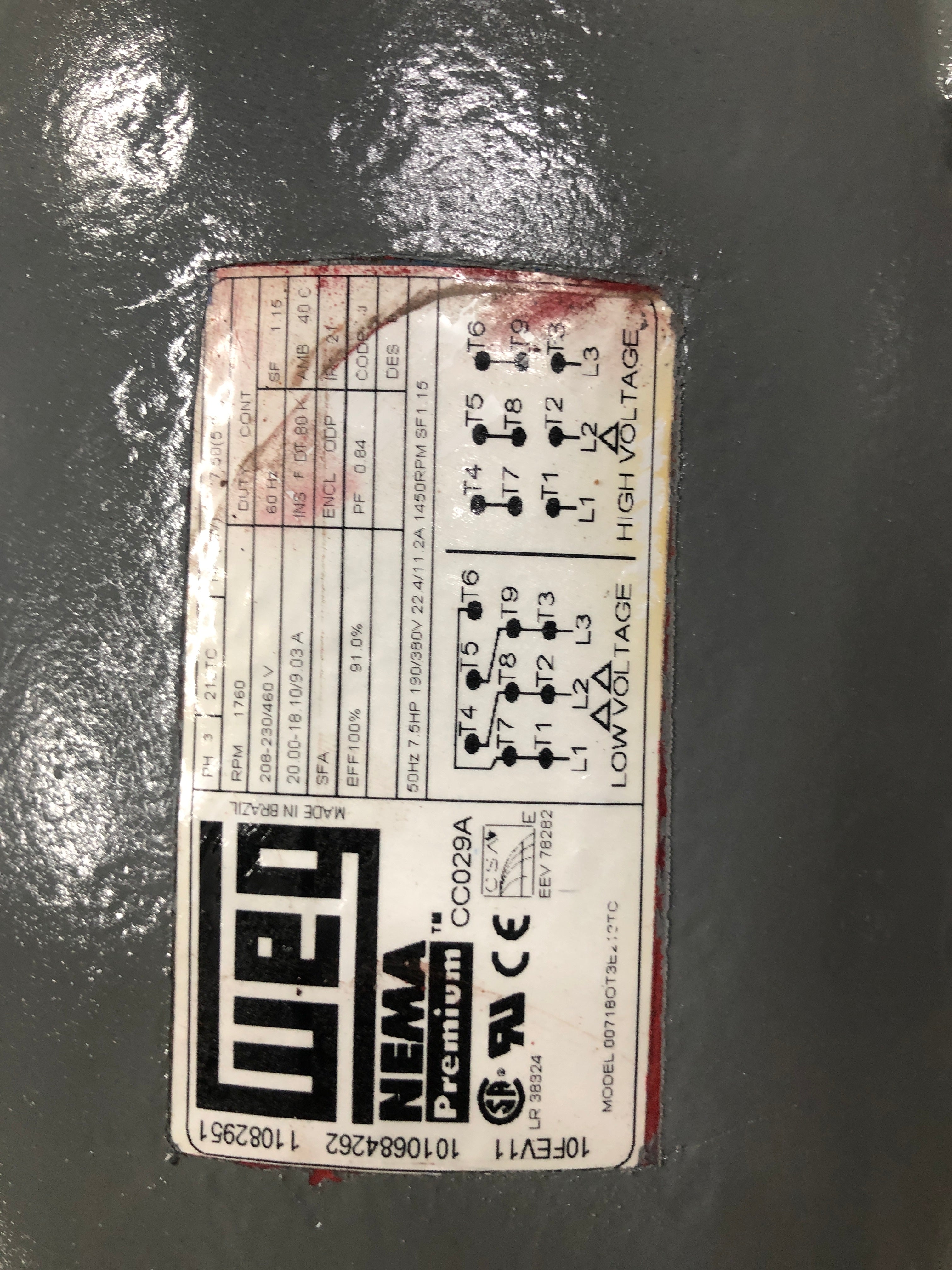 Armstrong 4030 Horizontal Base Mounted Series Centrifugal Pump - Model No: 3X2X10 4030, Serial No: 672385, Construction: BF-STD, Pump Capacity: 168.1GPM. Pump has been repainted. Baldor Motor - Cat No: M3710T, Spec: 376313Y659H1, HP: 7.5, Volts: 208-230/460, AMPS: 20.4/10.2, Rpm: 1760, Frame: 213T, Hz: 60, Ph: 3, Ser F: 1.15, Code: J, Des: B, Class: F, Rating: 40C AMB-Cont, Encl: ODP.