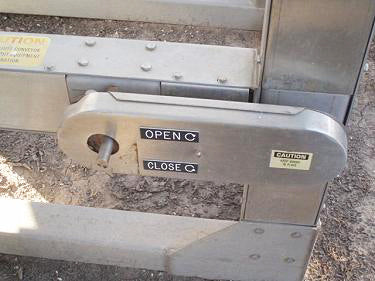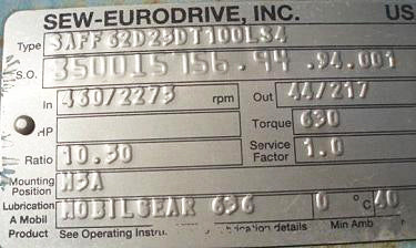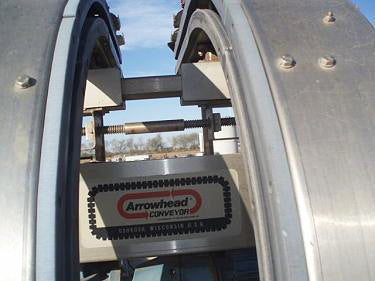 Arrowhead Conveyor Company Bottle Elevator. Model: GRIPPER S-EL. P.O: CSC 0109. S/O and Equip No: 076760SE. Line No: 301. Lines per chain: 238. Maximum opening width: 12 in. Sew-Eurodrive Motor (aperture), 3 hp, 1700 rpm, 230/460 V, 8.6/4.3 amps, 60 Hz, 3 phase. Sew-Eurodrive Variable Speed Reducer, 10.50 ratio, 44/217 rpm (min/max). Conveyor infeed height: 3 ft. Conveyor exit height: 11 ft. Overall dimensions: 8 ft. 10 in. L x 3 ft. 5 in. L x 11 ft. 4 in. H.