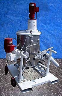 Audo Pre-Mix Tank- 35 Gallon. Model: 100B. S/N: 1143. Mixer dimensions: 8 in. dia. x 22 in. H. Seitz Werke Mixer Motor, 1/2 hp, 1680 rpm, 220 V, 2.1 amps, 60 Hz. Seitz Werke Pump Motor, 3/4 hp, 1655 rpm, 220 V, 2.6 amps, 60 Hz. Lewa Variable Speed Drive, min/max: 155/250 rpm. Inlets: (1) 2 in. dia. threaded fitting, (1) 2 in. dia. port. Outlets: (1) 5/8 in. dia. hose connection (male), (1) 1 in. dia. pump port, (1) 2-1/2 in. dia. Manually-operated lifting valve. Overall dimensions: 70 in. L x 52 in. W x 44-1/2 in. H.