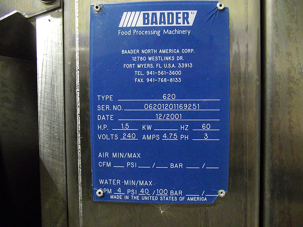 Baader Food Processing Machinery Fish Skinner. Model: 620. S/N: 06201201169251. Date: 2001. Made in the USA. SEW Parallel Helical Reducer Drive 1.5 hp (1.1 kW), 240 Volts, 4.75 Amps, 3phase, 147 RPM, 60 Hz. Water Min/Max: 4 GPM, 40 PSI / 100 BAR. *Note: machine is currently missing the outfeed conveyor belt. Previously installed at a USA fish processing facility. The 620 model is a multi-species skinning machine with working range of 12-70 CM total length fillets. Approximate throughput is 72-80 per minute. Designed for easy cleaning. Overall dimensions: 77.5 in. L x 44.5 in. W x 79 in. H. (ACN500)