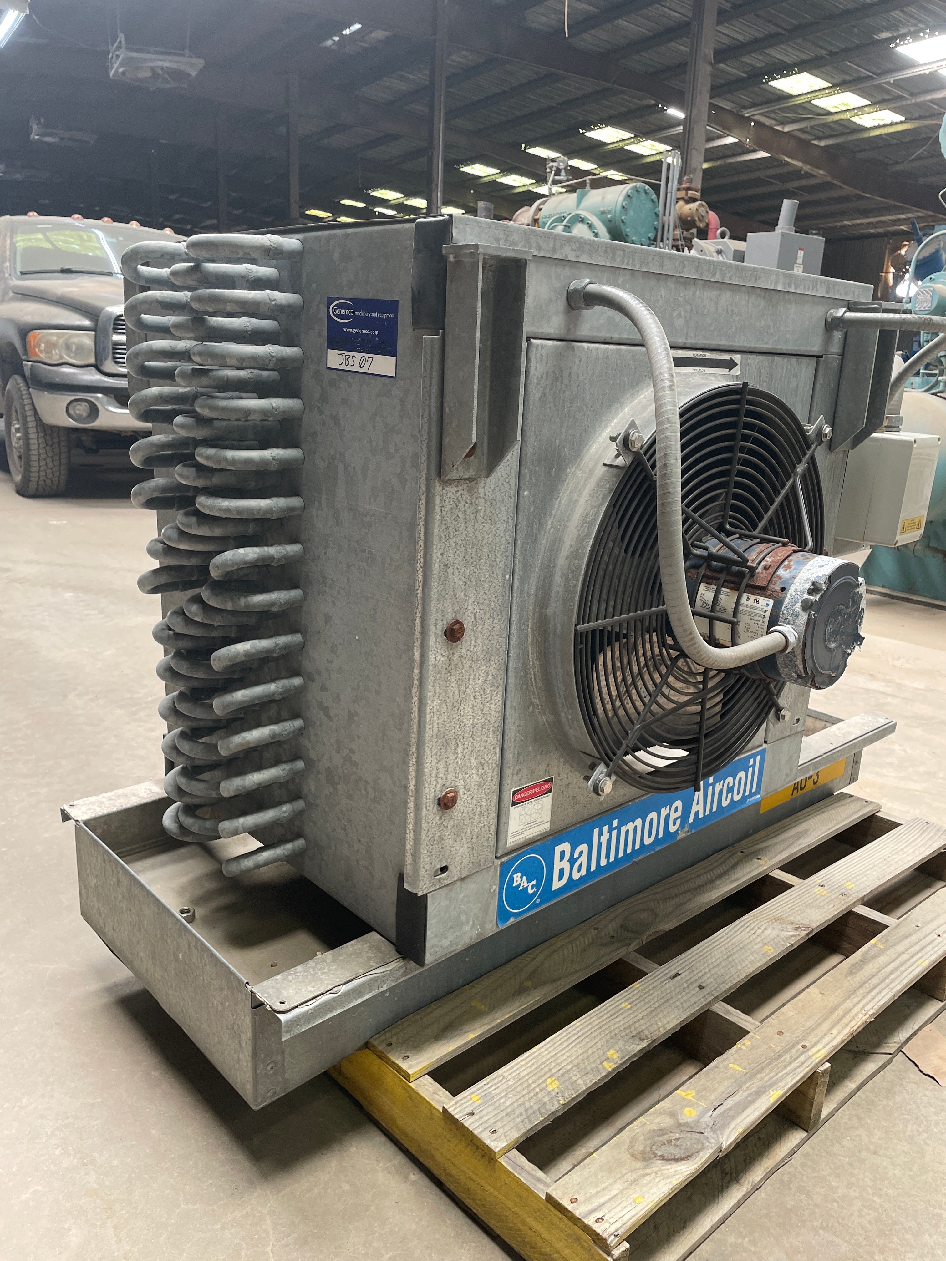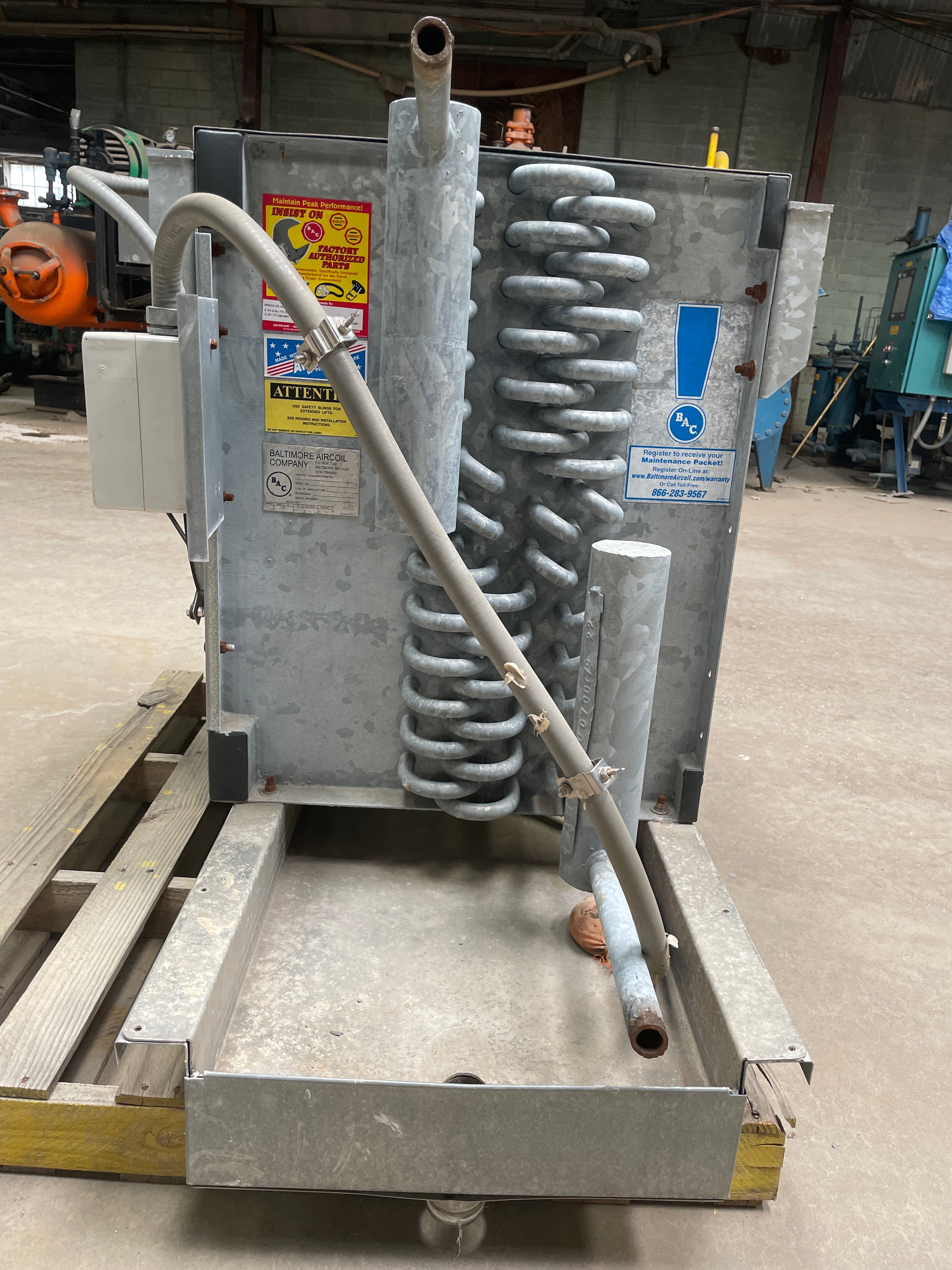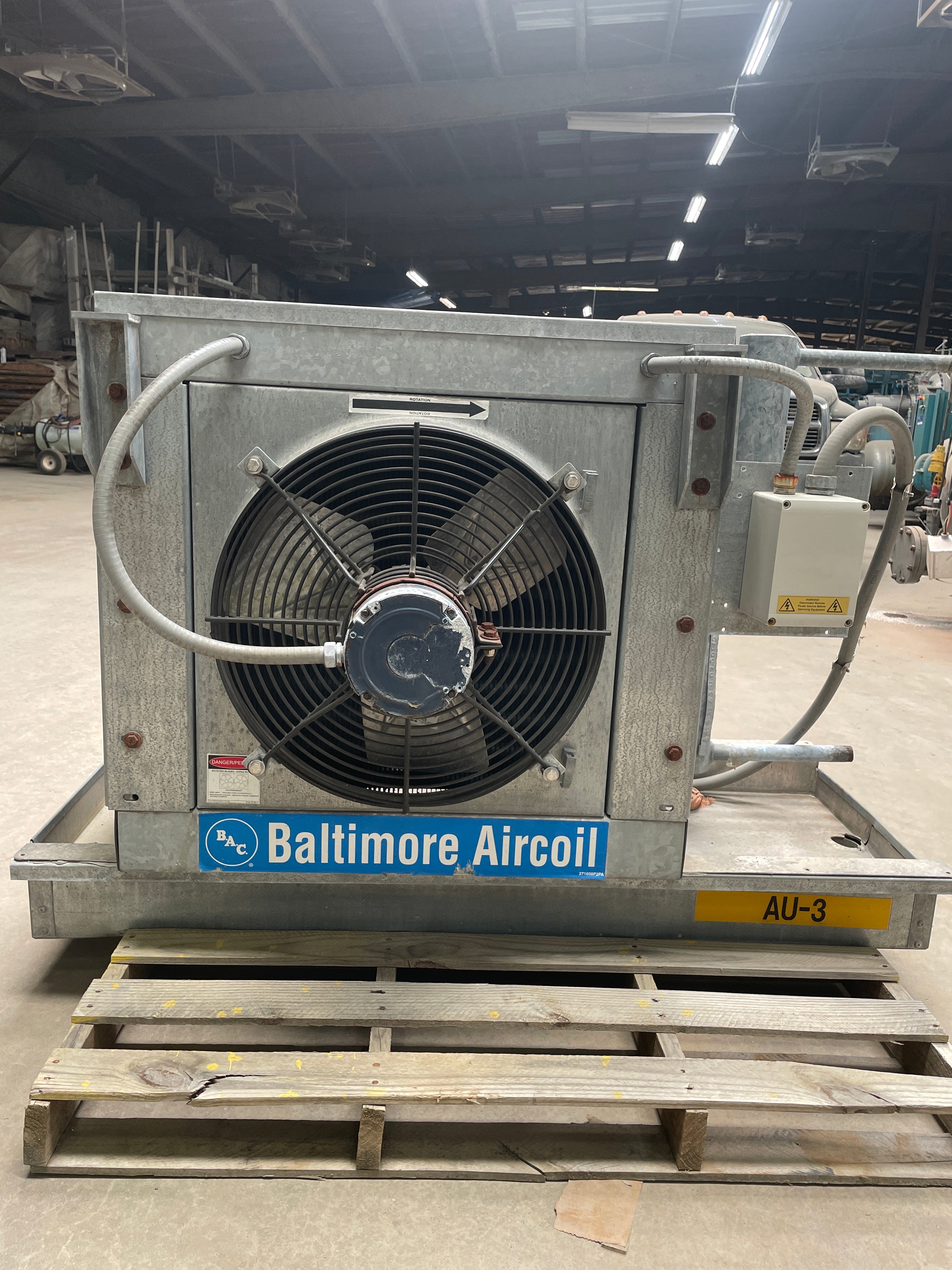 Baltimore AirCoil BAC AS1-3163-033LART-R-R Ammonia Evaporator Coil- 3.15 TR, 1 Fan (Low/Medium Temperature) This evaporator coil has a compatibility with both Low and Medium temperature coil. this allows it to function with either wet or frosted coils(TR) @15TD. A wet capacity of 2520 (BTUH / °F TD) and an estimated tonnage of 3.15(TR) @15TD. A frosted capacity of 2290 (BTUH / °F TD) and an estimated tonnage of 3(TR) @15TD. An Airflow of 3900 CFM with a face velocity of 575 FPM. The unit has recirculated top fed coils with a gas defrost system. The unit was previously run with Ammonia. The package includes one Bluffton motor for the fan.