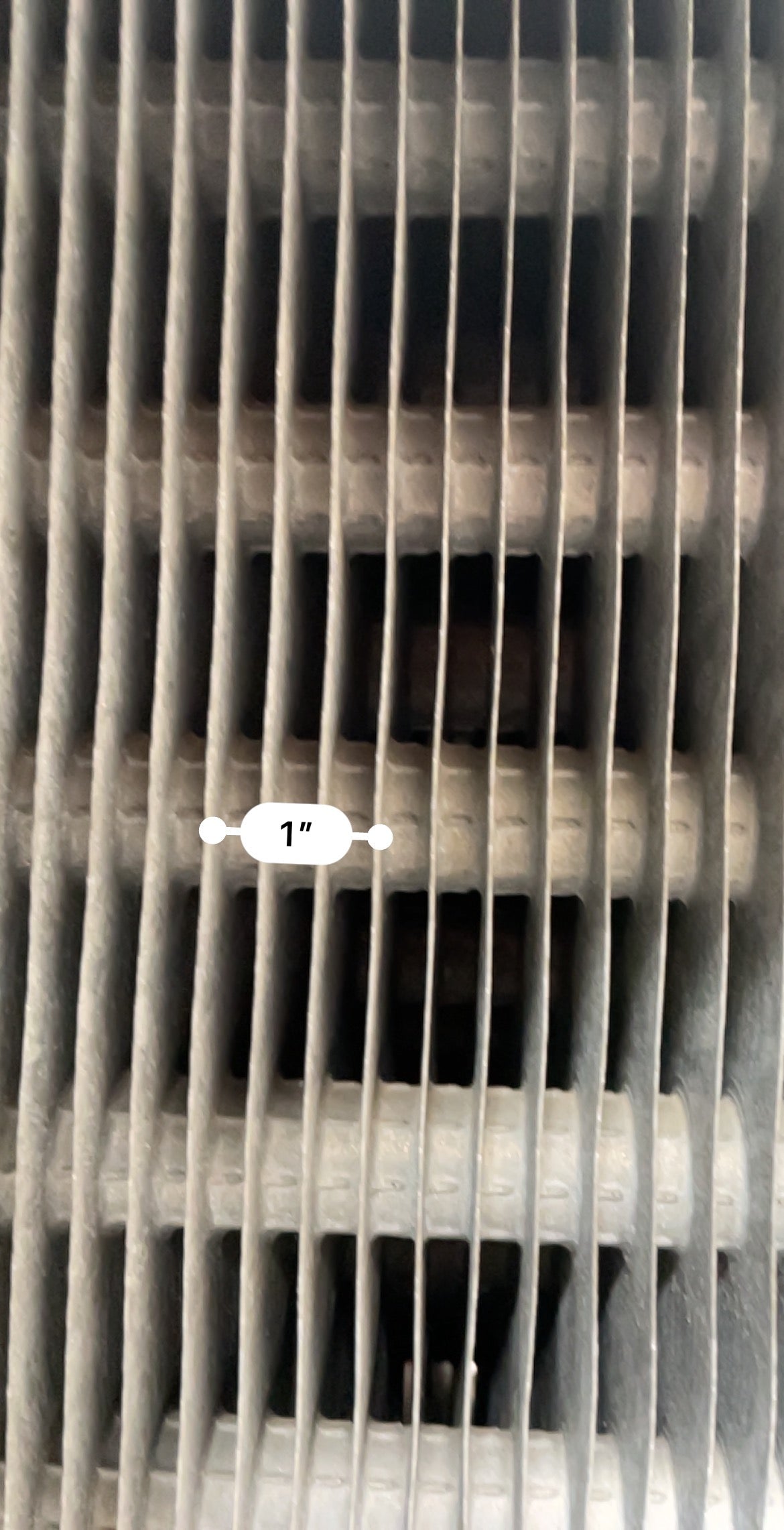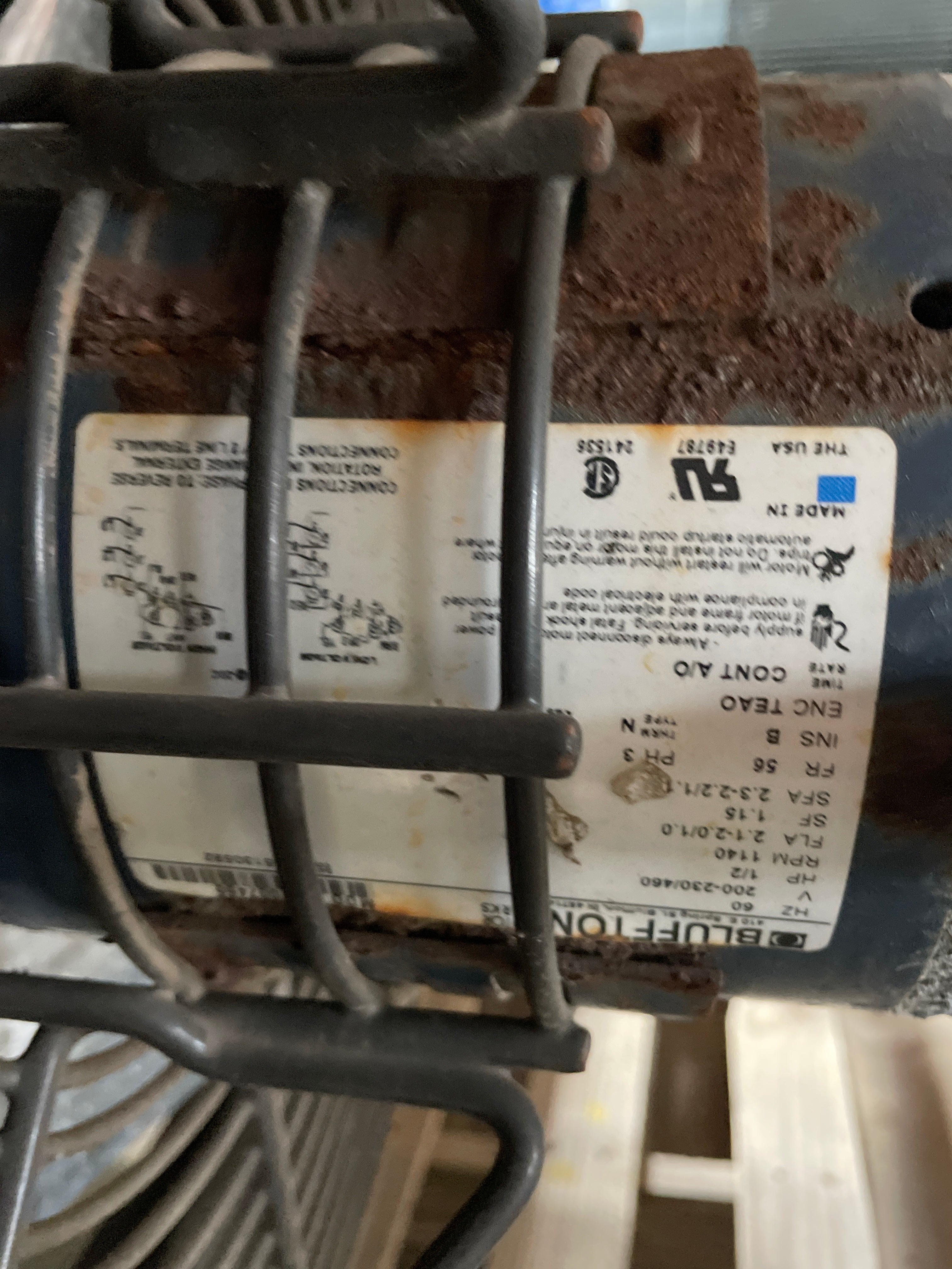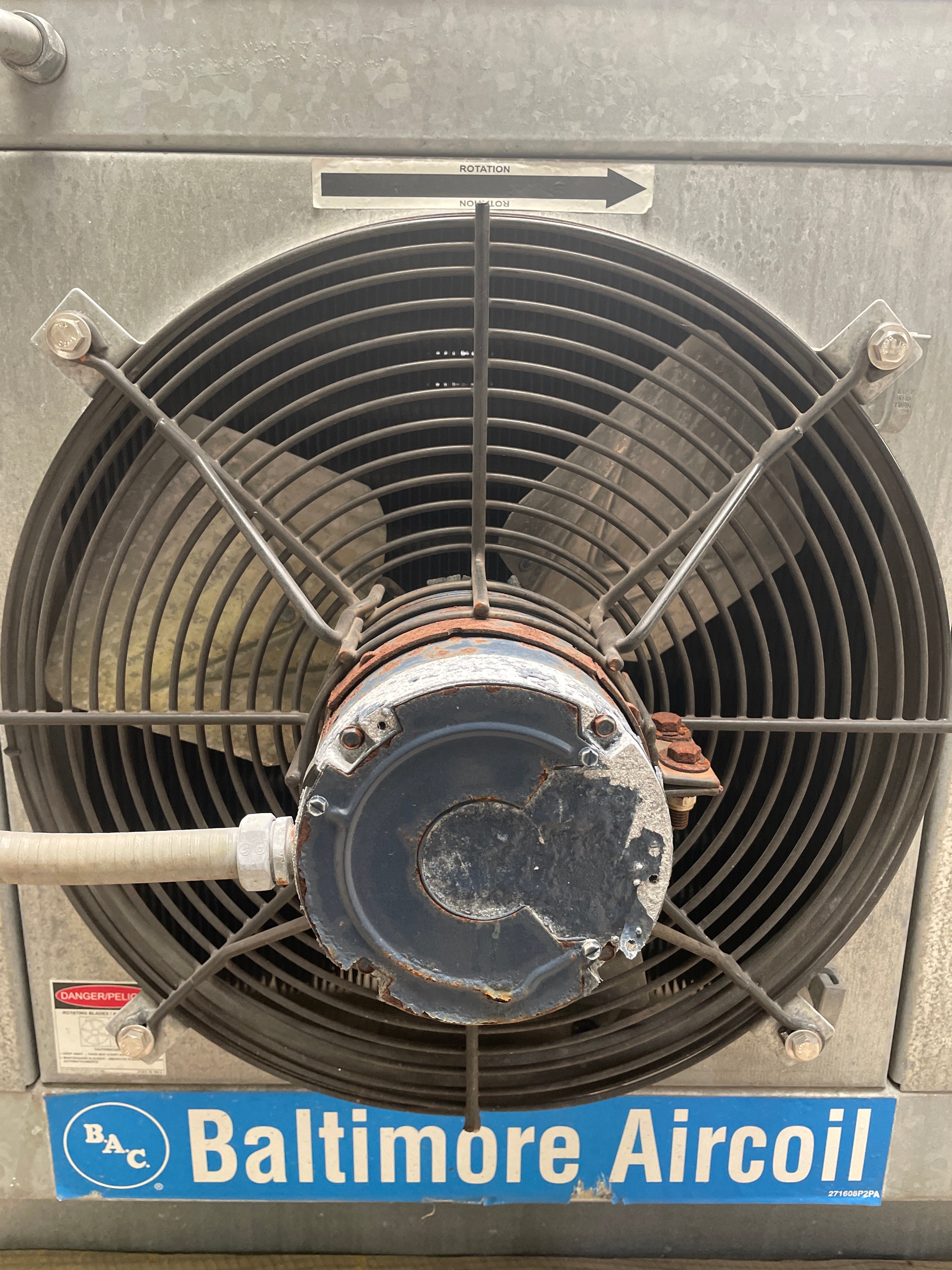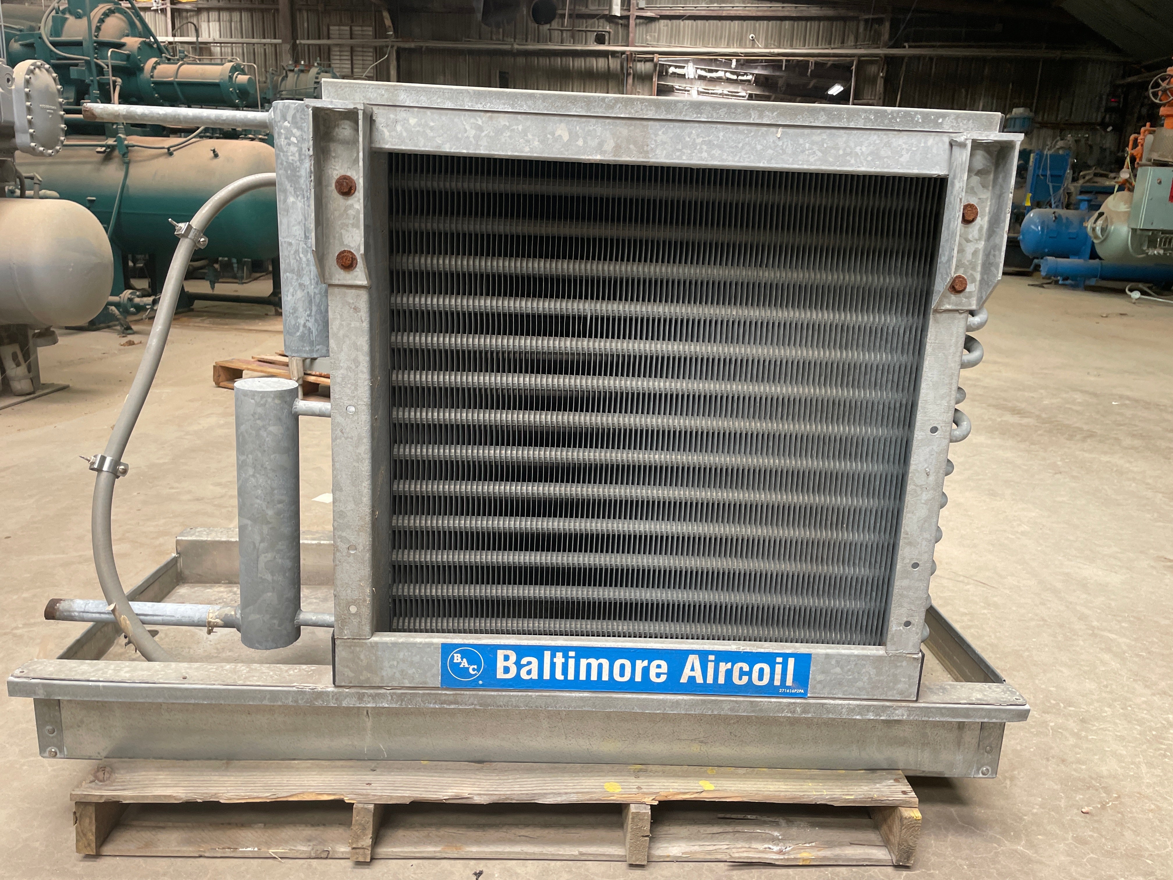 Baltimore AirCoil BAC AS1-3163-033LART-R-R Ammonia Evaporator Coil- 3.15 TR, 1 Fan (Low/Medium Temperature) This evaporator coil has a compatibility with both Low and Medium temperature coil. this allows it to function with either wet or frosted coils(TR) @15TD. A wet capacity of 2520 (BTUH / °F TD) and an estimated tonnage of 3.15(TR) @15TD. A frosted capacity of 2290 (BTUH / °F TD) and an estimated tonnage of 3(TR) @15TD. An Airflow of 3900 CFM with a face velocity of 575 FPM. The unit has recirculated top fed coils with a gas defrost system. The unit was previously run with Ammonia. The package includes one Bluffton motor for the fan.