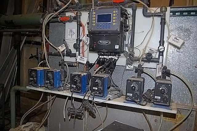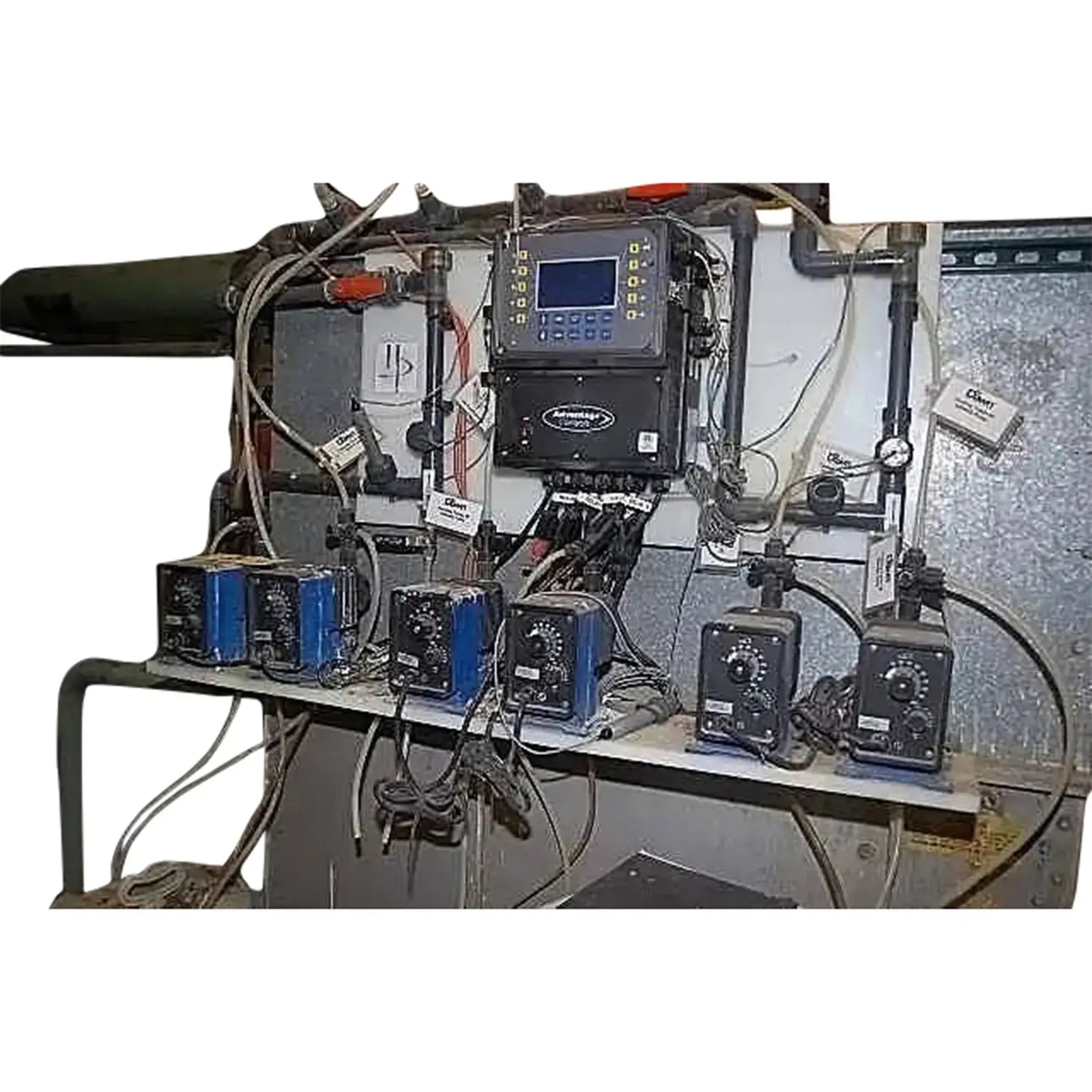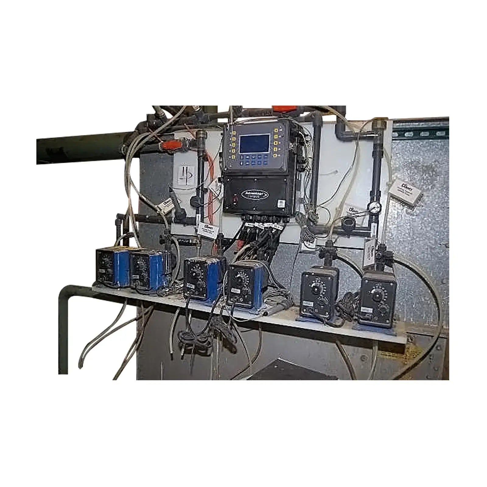 Baltimore Aircoil Company Cooling Tower Water Treatment System. Model: RS-335 C. Serial: 88400930. RS Remote Sump tanks offer simplified water treatment, freeze projection, facilitate dry operation, have easy maintenance, etc. for open and closed loop cooling towers as well as evaporative condenser systems. RS-335 specs: 257 gallon net volume, 4 in. suction port size, 470 lbs shipping weight, dimensions: 4.5 ft. L x 3 ft. 11 in. W x 4 ft. H. Also includes Advantage Controls MegaTron model: MGCPF2E-X2-H4 controller (tower conductivity control, pH control, F2 chemical feed timers, flow switch) with H4 internet phone modem communications. (6) PULSAfeeder brand PULSAtron Series A-Plus Metering Pumps.