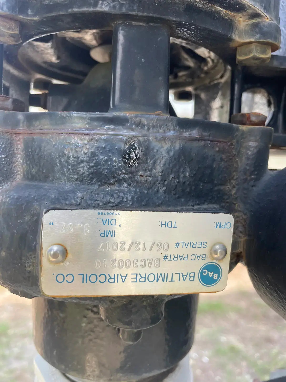 BAC 1 Tower Evaporative Condenser. Model No: VC1-150P. Serial No: U175997201-01-01. Belt No: B096. Nominal Tons: 150. Ammonia Tons: 106. CFM: 28,200. Internal Coil Volume: 18. Base Heat Rejection: 2205. R-717 Operation Charge (ft3): 170. Recommended GPM: 220. Pump Motor: 1.5 HP. Remote Sump - Drain Size (in): 6, Approximate Operating. Weight: 7880, Gallons Required: 140. Approximate Weights(LBS) - Shipping 7480, Heaviest Section: 4920, Operating: 8730.