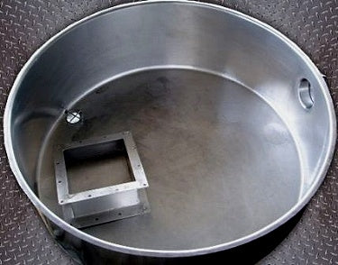 Balance Tank-120 Gallon, Stainless Steel. (4) legs 9 in. H. Top has hopper- 11-1/2 in. dia. Tank has 13 in. x 13 in. square removable splashguard. Inlets/outlets: (3) 2 in. threaded inlets, (1) 2 in. tri-clamp inlet, (1) 3 in. 90° outlet, (1) 5 in. side overflow outlet. Overall dimensions: 49 in. L x 48 in. W x 35-1/2 in. H.