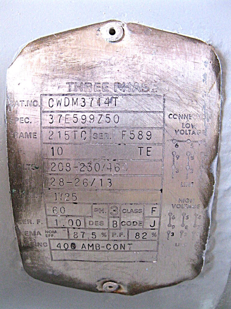 Used Baldor Industrial Motor, 10 Hp, 1725 RPM, 208-230/460 V, 28-26/13 A, 60 Hz, 3 Phase, 215TC Frame. Electric motor previously used with a Fristam FP3551 Pump – 10 HP. Does not include pump.