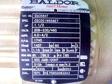 Baldor Electric Motor- 1-1/2 HP. S/N: F0602083243. Cat. No: EM3584T. Spec. No: 05C001W659E7. Motor specifications: 1740 rpm, 208-230/460 V, 4.2-4/2 amps, 60 Hz, 3 phase. Shaft diameter: 1 in. Code: K. Nema design: B. Frame: 145T. Insulation class: F. Enclosure: TEFC. Continuous duty. Overall dimensions: 1 ft. L x 10 in. W x 7 in. H.