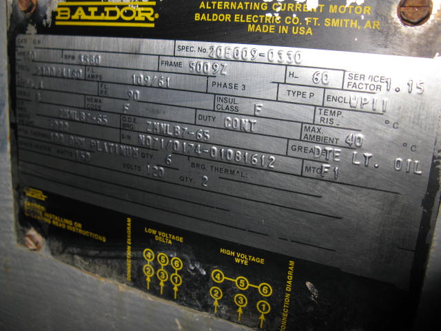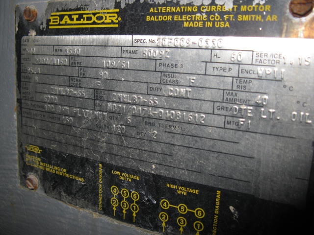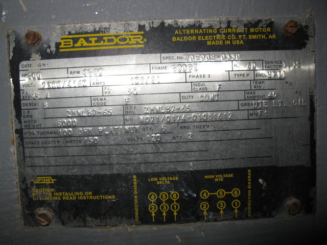 Baldor Electric Motor - 500 HP. Specification Number 20E009-0330. S/N: N071/0174-01081612. Motor specifications: 3580 rpm, 2300 / 4160 V, 109/61 amps, 60 Hz, 3 phase. Continuous duty. Enclosure: WPII. Frame: 5009Z. Insulation class: F. NEMA code: F. Weight: 6000. Overall dimensions: 4 ft. 4 in. L x 4 ft. W x 4 ft. 4 in. H.(H10).