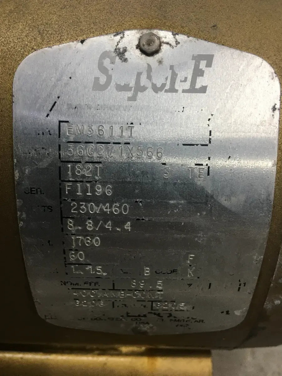 Baldor EM3611T Motor (3 HP, 1760 RPM, 230/460 V)  Serial Number: 36C271X566. 3 HP. Motor RPM: 1760. Motor Voltage:1760. Motor Voltage: 230/460. Motor Amps: 8.8/4.4. Motor Hertz (HZ): 60. Motor Phases: 3. Motor Frame Size: 182T. Shipping Dimensions (Inches): 18x12x10. Weight(lbs): 68