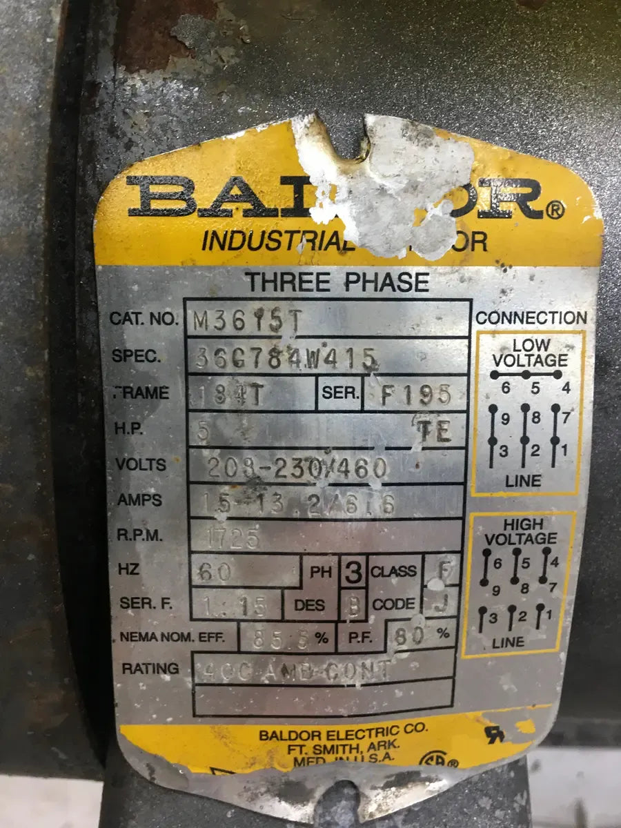 Baldor M3615T Motor (5 HP, 1725 RPM, 208-230/460 V)  Serial Number: F195. 5 HP. Motor RPM: 1725. Motor Voltage:1725. Motor Voltage: 208-230/460. Motor Amps: 15-13 . Motor Hertz (HZ): 60. Motor Phases: 3. Motor Frame Size: 184T. Shipping Dimensions (Inches): 18x11x10. Weight(lbs): 80