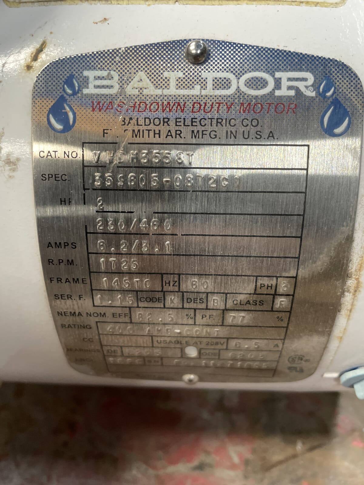 Baldor VHDH3558T Motor (2 HP, 1725 RPM, 230/460 V) Serial Number: FO311271855. 2 HP. Motor RPM: 1725. Motor Voltage:1725. Motor Voltage: 230/460. Motor Amps: 6.2/3.1. Motor Hertz (HZ): 60. Motor Phases: 3. Motor Frame Size: 145TC. Shipping Dimensions (Inches): 18x12x10. Weight(lbs): 65 Unused Washdown Duty Motor Spec No: 35S805-0872G1