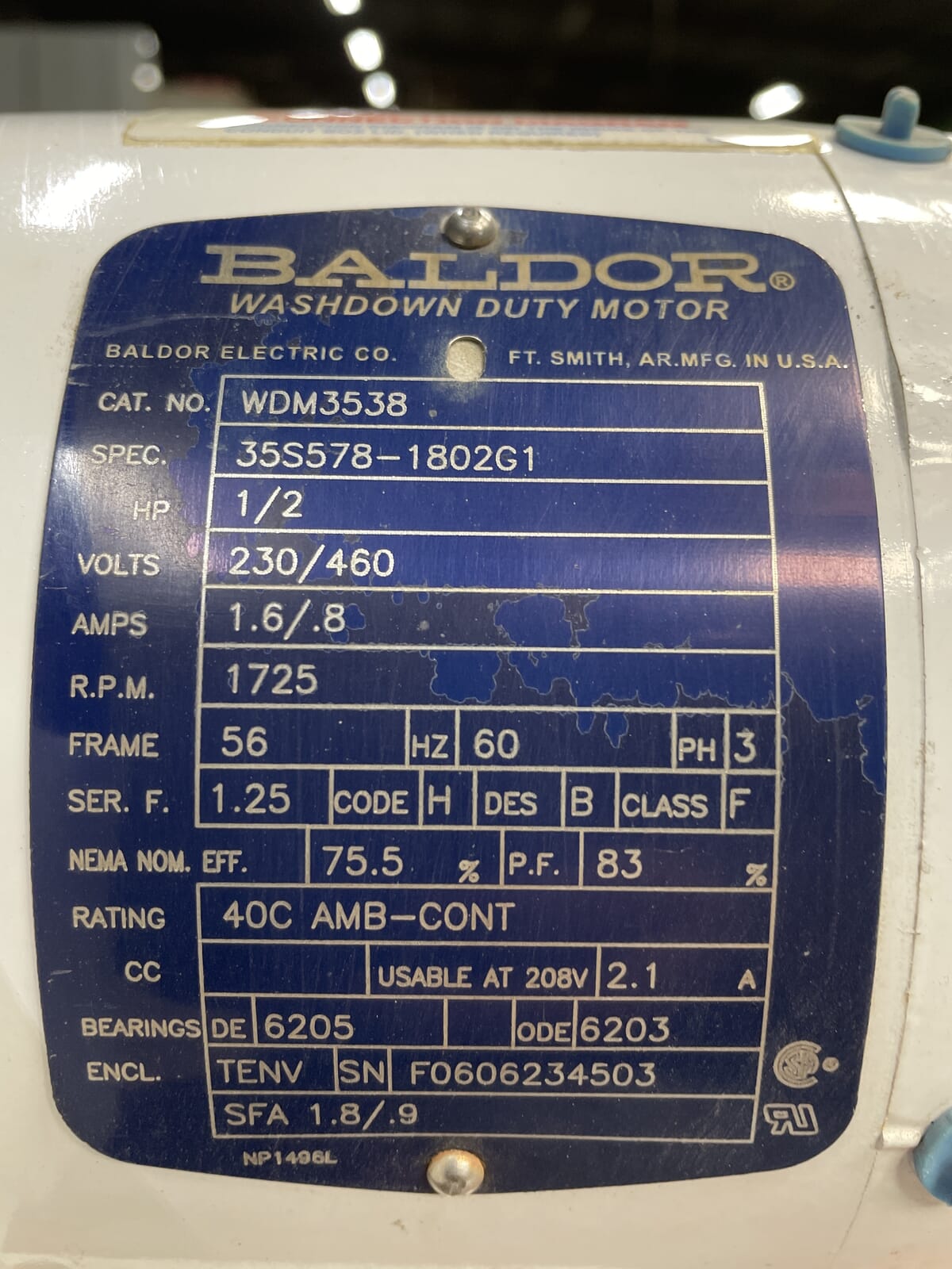 Baldor WDM3538 Motor (0.5 HP, 1725 RPM, 230/460 V) Serial Number: F0606234503. 0.5 HP. Motor RPM: 1725. Motor Voltage:1725. Motor Voltage: 230/460. Motor Amps: 1.6/.8. Motor Hertz (HZ): 60. Motor Phases: 3. Motor Frame Size: 56. Shipping Dimensions (Inches): 16x9x7. Weight(lbs): 40 Unused Washdown Duty Motor Spec No: 35S578-1802G1